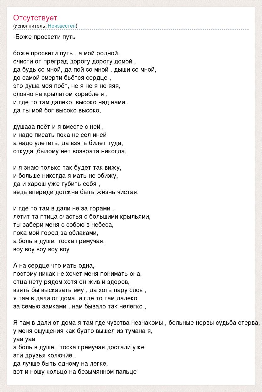 -Боже просвети путь боже просвети путь , а мой родной, очисти от преград дорогу дорогу домой , да будь со мной, да пой со мной , дыши со мной, до самой смерти бьётся сердце , это душа моя поёт, не я не я не яяя, словно на крылатом корабле я , и где то там далеко, высоко над нами , да ты мой бог высоко высоко, душааа поёт и я вместе с ней , и надо писать пока не сел иней а надо улететь, да взять билет туда, откуда ,былому нет возврата никогда, и я знаю только так будет так вижу, и больше никогда я мать не обижу, да и харош уже губить себя , ведь впереди должна быть жизнь чистая, и где то там в дали не за горами , летит та птица счастья с большими крыльями, ты забери меня с собою в небеса, пока мой город за облаками, а боль в душе, тоска гремучая, воу воу воу воу воу А на сердце что мать одна, поэтому никак не хочет меня понимать она, отца нету рядом хотя он жив и здоров, взять бы высказать ему , да хоть пару слов , я там в дали от дома, и где то там далеко за семью замками , нам бывало так нелегко , Я там в дали от дома я там где чувства незнакомы , больные нервы судьба стерва, у меня ощущения как будто вышел из тумана я, уаа уаа а боль в душе , тоска гремучая достали уже эти друзья колючие , да лучше быть одному на легке, вот и ношу кольцо на безымянном пальце