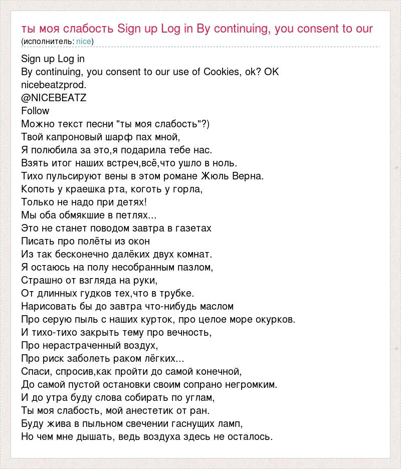 Sign up Log in By continuing, you consent to our use of Cookies, ok? OK nicebeatzprod. @NICEBEATZ Follow Можно текст песни "ты моя слабость"?) Твой капроновый шарф пах мной, Я полюбила за это,я подарила тебе нас. Взять итог наших встреч,всё,что ушло в ноль. Тихо пульсируют вены в этом романе Жюль Верна. Копоть у краешка рта, коготь у горла, Только не надо при детях! Мы оба обмякшие в петлях... Это не станет поводом завтра в газетах Писать про полёты из окон Из так бесконечно далёких двух комнат. Я остаюсь на полу несобранным пазлом, Страшно от взгляда на руки, От длинных гудков тех,что в трубке. Нарисовать бы до завтра что-нибудь маслом Про серую пыль с наших курток, про целое море окурков. И тихо-тихо закрыть тему про вечность, Про нерастраченный воздух, Про риск заболеть раком лёгких... Спаси, спросив,как пройти до самой конечной, До самой пустой остановки своим сопрано негромким. И до утра буду слова собирать по углам, Ты моя слабость, мой анестетик от ран. Буду жива в пыльном свечении гаснущих ламп, Но чем мне дышать, ведь воздуха здесь не осталось.