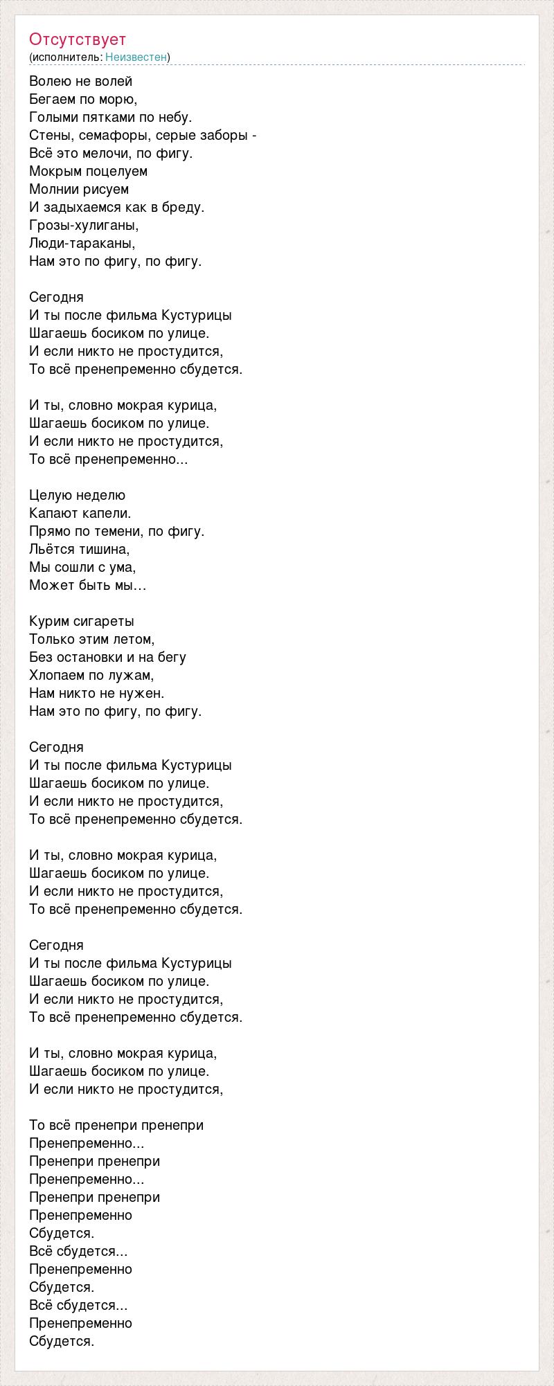 Волею не волей Бегаем по морю, Голыми пятками по небу. Стены, семафоры, серые заборы - Всё это мелочи, по фигу. Мокрым поцелуем Молнии рисуем И задыхаемся как в бреду. Грозы-хулиганы, Люди-тараканы, Нам это по фигу, по фигу. Сегодня И ты после фильма Кустурицы Шагаешь босиком по улице. И если никто не простудится, То всё пренепременно сбудется. И ты, словно мокрая курица, Шагаешь босиком по улице. И если никто не простудится, То всё пренепременно... Целую неделю Капают капели. Прямо по темени, по фигу. Льётся тишина, Мы сошли с ума, Может быть мы… Курим сигареты Только этим летом, Без остановки и на бегу Хлопаем по лужам, Нам никто не нужен. Нам это по фигу, по фигу. Сегодня И ты после фильма Кустурицы Шагаешь босиком по улице. И если никто не простудится, То всё пренепременно сбудется. И ты, словно мокрая курица, Шагаешь босиком по улице. И если никто не простудится, То всё пренепременно сбудется. Сегодня И ты после фильма Кустурицы Шагаешь босиком по улице. И если никто не простудится, То всё пренепременно сбудется. И ты, словно мокрая курица, Шагаешь босиком по улице. И если никто не простудится, То всё пренепри пренепри Пренепременно... Пренепри пренепри Пренепременно... Пренепри пренепри Пренепременно Сбудется. Всё сбудется... Пренепременно Сбудется. Всё сбудется... Пренепременно Сбудется.