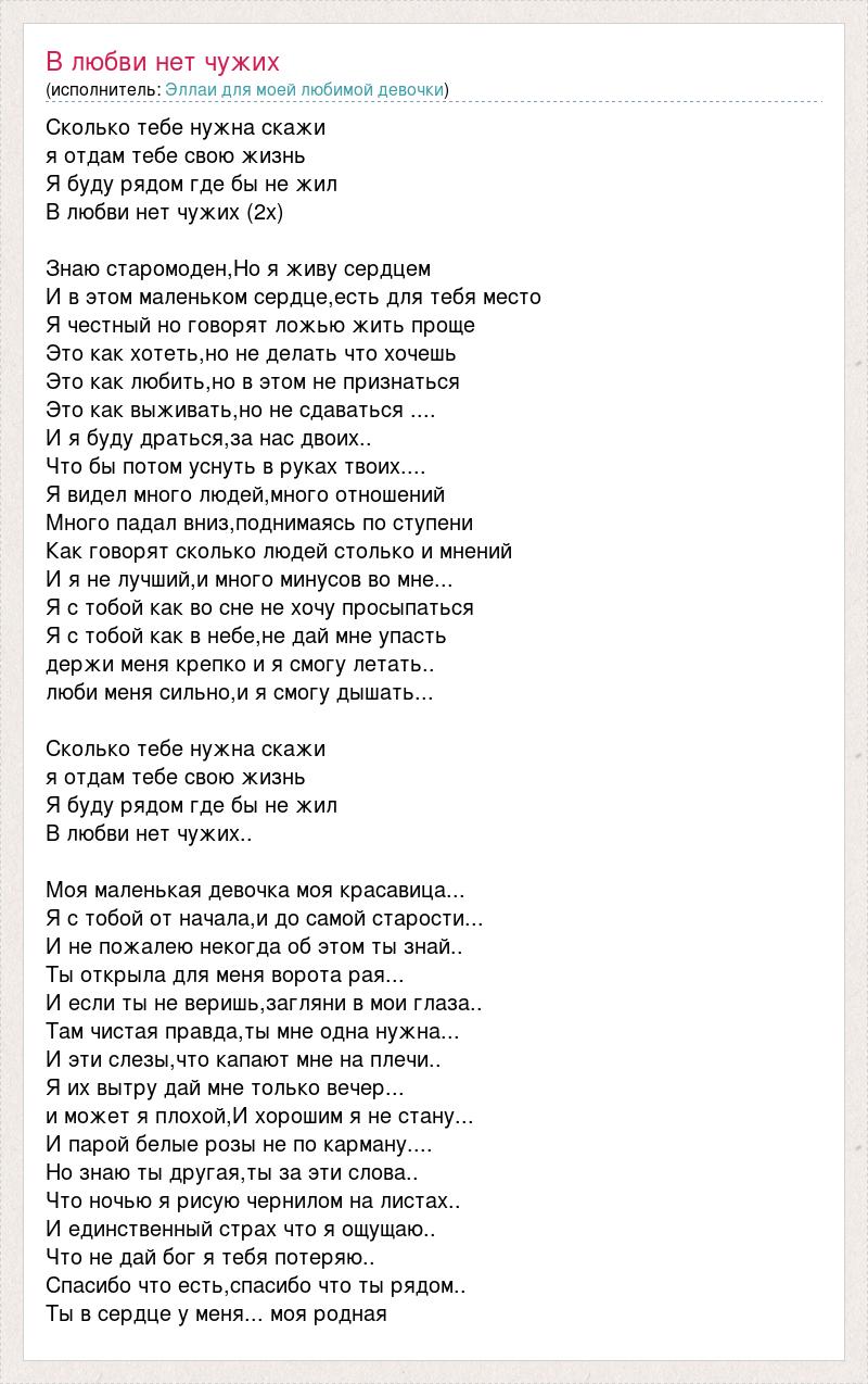 Сколько тебе нужна скажи я отдам тебе свою жизнь Я буду рядом где бы не жил В любви нет чужих (2х) Знаю старомоден,Но я живу сердцем И в этом маленьком сердце,есть для тебя место Я честный но говорят ложью жить проще Это как хотеть,но не делать что хочешь Это как любить,но в этом не признаться Это как выживать,но не сдаваться .... И я буду драться,за нас двоих.. Что бы потом уснуть в руках твоих.... Я видел много людей,много отношений Много падал вниз,поднимаясь по ступени Как говорят сколько людей столько и мнений И я не лучший,и много минусов во мне... Я с тобой как во сне не хочу просыпаться Я с тобой как в небе,не дай мне упасть держи меня крепко и я смогу летать.. люби меня сильно,и я смогу дышать... Сколько тебе нужна скажи я отдам тебе свою жизнь Я буду рядом где бы не жил В любви нет чужих.. Моя маленькая девочка моя красавица... Я с тобой от начала,и до самой старости... И не пожалею некогда об этом ты знай.. Ты открыла для меня ворота рая... И если ты не веришь,загляни в мои глаза.. Там чистая правда,ты мне одна нужна... И эти слезы,что капают мне на плечи.. Я их вытру дай мне только вечер... и может я плохой,И хорошим я не стану... И парой белые розы не по карману.... Но знаю ты другая,ты за эти слова.. Что ночью я рисую чернилом на листах.. И единственный страх что я ощущаю.. Что не дай бог я тебя потеряю.. Спасибо что есть,спасибо что ты рядом.. Ты в сердце у меня... моя родная