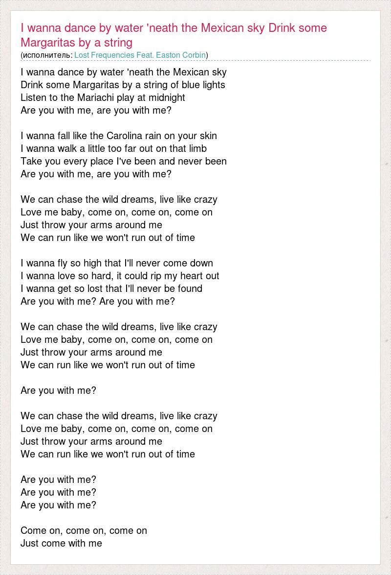 I wanna dance by water 'neath the Mexican sky Drink some Margaritas by a string of blue lights Listen to the Mariachi play at midnight Are you with me, are you with me? I wanna fall like the Carolina rain on your skin I wanna walk a little too far out on that limb Take you every place I've been and never been Are you with me, are you with me? We can chase the wild dreams, live like crazy Love me baby, come on, come on, come on Just throw your arms around me We can run like we won't run out of time I wanna fly so high that I'll never come down I wanna love so hard, it could rip my heart out I wanna get so lost that I'll never be found Are you with me? Are you with me? We can chase the wild dreams, live like crazy Love me baby, come on, come on, come on Just throw your arms around me We can run like we won't run out of time Are you with me? We can chase the wild dreams, live like crazy Love me baby, come on, come on, come on Just throw your arms around me We can run like we won't run out of time Are you with me? Are you with me? Are you with me? Come on, come on, come on Just come with me