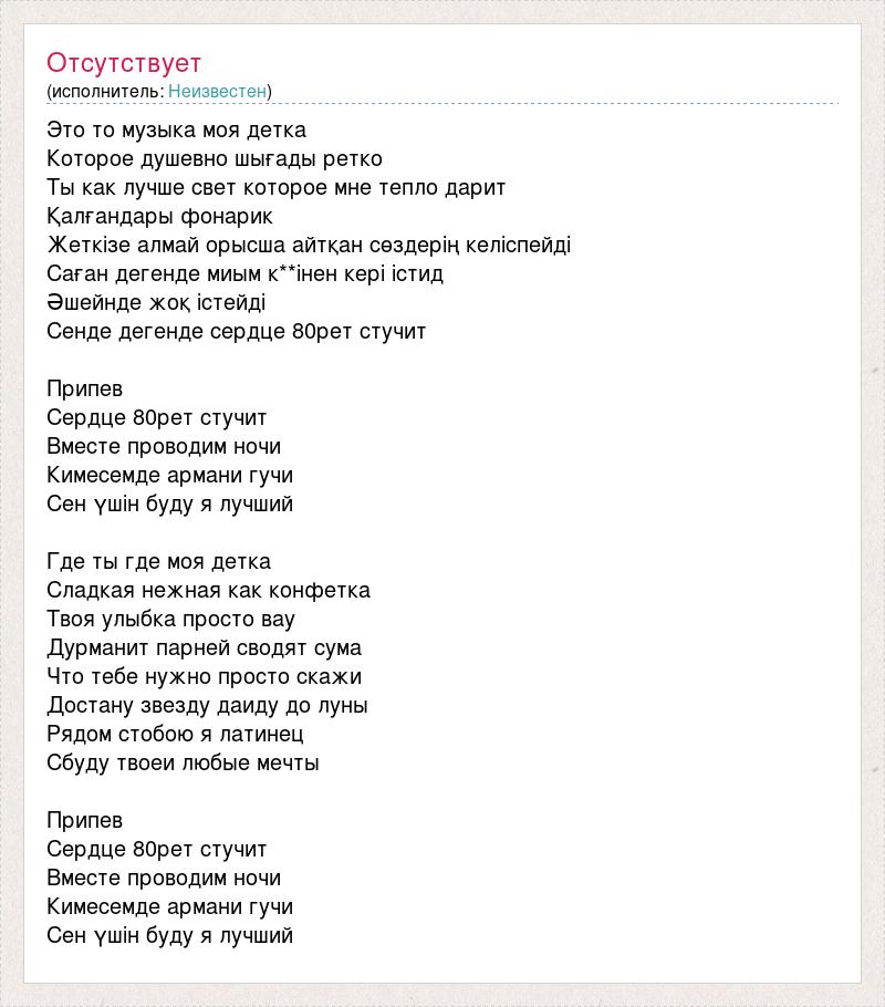 Это то музыка моя детка Которое душевно шығады ретко Ты как лучше свет которое мне тепло дарит Қалғандары фонарик Жеткізе алмай орысша айтқан сөздерің келіспейді Саған дегенде миым к**інен кері істид Əшейнде жоқ істейді Сенде дегенде сердце 80рет стучит Припев Сердце 80рет стучит Вместе проводим ночи Кимесемде армани гучи Сен үшін буду я лучший Где ты где моя детка Сладкая нежная как конфетка Твоя улыбка просто вау Дурманит парней сводят сума Что тебе нужно просто скажи Достану звезду даиду до луны Рядом стобою я латинец Сбуду твоеи любые мечты Припев Сердце 80рет стучит Вместе проводим ночи Кимесемде армани гучи Сен үшін буду я лучший