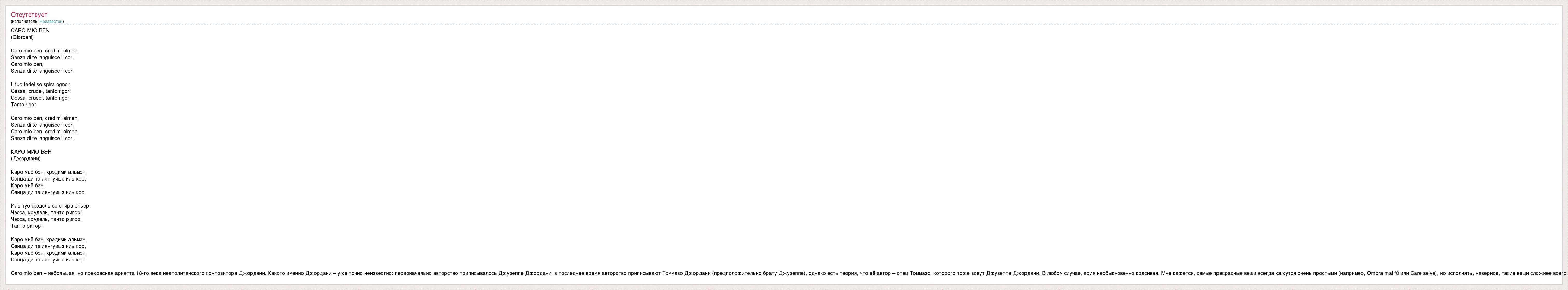 CARO MIO BEN (Giordani) Caro mio ben, credimi almen, Senza di te languisce il cor, Caro mio ben, Senza di te languisce il cor. Il tuo fedel so spira ognor. Cessa, crudel, tanto rigor! Cessa, crudel, tanto rigor, Tanto rigor! Caro mio ben, credimi almen, Senza di te languisce il cor, Caro mio ben, credimi almen, Senza di te languisce il cor. КАРО МИО БЭН (Джордани) Каро мьё бэн, крэдими альмэн, Сэнца ди тэ лянгуишэ иль кор, Каро мьё бэн, Сэнца ди тэ лянгуишэ иль кор. Иль туо фэдэль со спира оньёр. Чэсса, крудэль, танто ригор! Чэсса, крудэль, танто ригор, Танто ригор! Каро мьё бэн, крэдими альмэн, Сэнца ди тэ лянгуишэ иль кор, Каро мьё бэн, крэдими альмэн, Сэнца ди тэ лянгуишэ иль кор. Caro mio ben – небольшая, но прекрасная ариетта 18-го века неаполитанского композитора Джордани. Какого именно Джордани – уже точно неизвестно: первоначально авторство приписывалось Джузеппе Джордани, в последнее время авторство приписывают Томмазо Джордани (предположительно брату Джузеппе), однако есть теория, что её автор – отец Томмазо, которого тоже зовут Джузеппе Джордани. В любом случае, ария необыкновенно красивая. Мне кажется, самые прекрасные вещи всегда кажутся очень простыми (например, Ombra mai fù или Care selve), но исполнять, наверное, такие вещи сложнее всего.