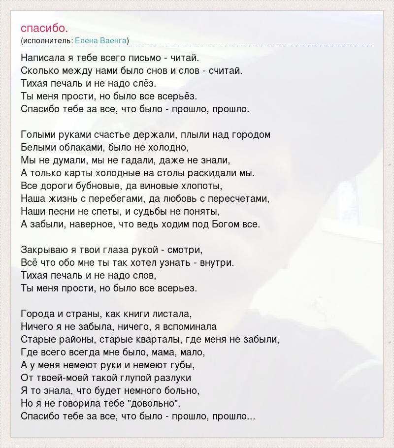 Написала я тебе всего письмо - читай. Сколько между нами было снов и слов - считай. Тихая печаль и не надо слёз. Ты меня прости, но было все всерьёз. Спасибо тебе за все, что было - прошло, прошло. Голыми руками счастье держали, плыли над городом Белыми облаками, было не холодно, Мы не думали, мы не гадали, даже не знали, А только карты холодные на столы раскидали мы. Все дороги бубновые, да виновые хлопоты, Наша жизнь с перебегами, да любовь с пересчетами, Наши песни не спеты, и судьбы не поняты, А забыли, наверное, что ведь ходим под Богом все. Закрываю я твои глаза рукой - смотри, Всё что обо мне ты так хотел узнать - внутри. Тихая печаль и не надо слов, Ты меня прости, но было все всерьез. Города и страны, как книги листала, Ничего я не забыла, ничего, я вспоминала Старые районы, старые кварталы, где меня не забыли, Где всего всегда мне было, мама, мало, А у меня немеют руки и немеют губы, От твоей-моей такой глупой разлуки Я то знала, что будет немного больно, Но я не говорила тебе "довольно". Спасибо тебе за все, что было - прошло, прошло...