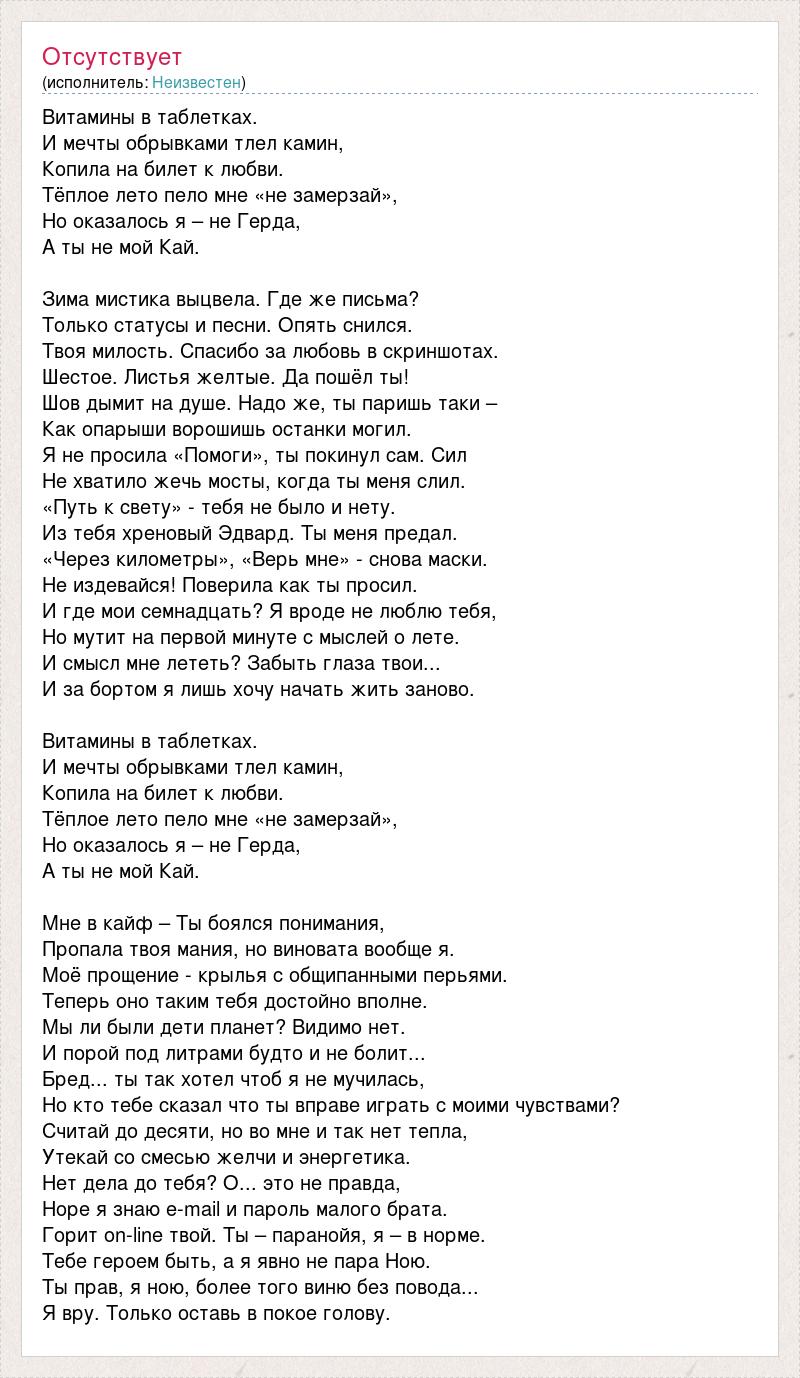 Витамины в таблетках. И мечты обрывками тлел камин, Копила на билет к любви. Тёплое лето пело мне «не замерзай», Но оказалось я – не Герда, А ты не мой Кай. Зима мистика выцвела. Где же письма? Только статусы и песни. Опять снился. Твоя милость. Спасибо за любовь в скриншотах. Шестое. Листья желтые. Да пошёл ты! Шов дымит на душе. Надо же, ты паришь таки – Как опарыши ворошишь останки могил. Я не просила «Помоги», ты покинул сам. Сил Не хватило жечь мосты, когда ты меня слил. «Путь к свету» - тебя не было и нету. Из тебя хреновый Эдвард. Ты меня предал. «Через километры», «Верь мне» - снова маски. Не издевайся! Поверила как ты просил. И где мои семнадцать? Я вроде не люблю тебя, Но мутит на первой минуте с мыслей о лете. И смысл мне лететь? Забыть глаза твои... И за бортом я лишь хочу начать жить заново. Витамины в таблетках. И мечты обрывками тлел камин, Копила на билет к любви. Тёплое лето пело мне «не замерзай», Но оказалось я – не Герда, А ты не мой Кай. Мне в кайф – Ты боялся понимания, Пропала твоя мания, но виновата вообще я. Моё прощение - крылья с общипанными перьями. Теперь оно таким тебя достойно вполне. Мы ли были дети планет? Видимо нет. И порой под литрами будто и не болит... Бред... ты так хотел чтоб я не мучилась, Но кто тебе сказал что ты вправе играть с моими чувствами? Считай до десяти, но во мне и так нет тепла, Утекай со смесью желчи и энергетика. Нет дела до тебя? О... это не правда, Норе я знаю e-mail и пароль малого брата. Горит on-line твой. Ты – паранойя, я – в норме. Тебе героем быть, а я явно не пара Ною. Ты прав, я ною, более того виню без повода... Я вру. Только оставь в покое голову.