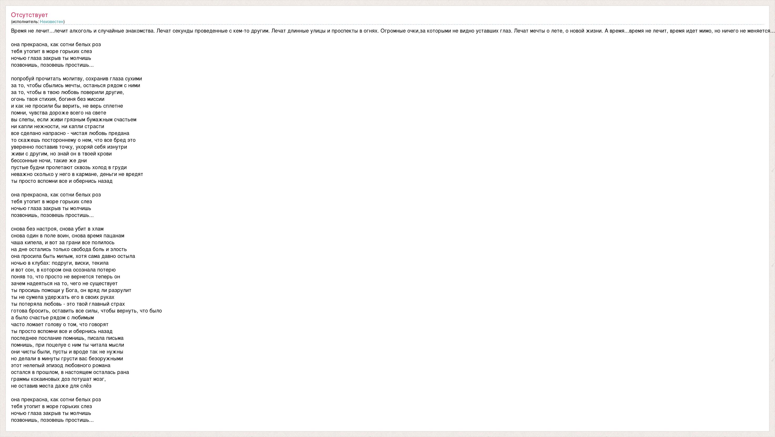 Время не лечит...лечит алкоголь и случайные знакомства. Лечат секунды проведенные с кем-то другим. Лечат длинные улицы и проспекты в огнях. Огромные очки,за которыми не видно уставших глаз. Лечат мечты о лете, о новой жизни. А время...время не лечит, время идет мимо, но ничего не меняется... она прекрасна, как сотни белых роз тебя утопит в море горьких слез ночью глаза закрыв ты молчишь позвонишь, позовешь простишь... попробуй прочитать молитву, сохранив глаза сухими за то, чтобы сбылись мечты, останься рядом с ними за то, чтобы в твою любовь поверили другие, огонь твоя стихия, богиня без миссии и как не просили бы верить, не верь сплетне помни, чувства дороже всего на свете вы слепы, если живи грязным бумажным счастьем ни капли нежности, ни капли страсти все сделано напрасно - чистая любовь предана то скажешь постороннему о нем, что все бред это уверенно поставив точку, укоряй себя изнутри живи с другим, но знай он в твоей крови бессонные ночи, такие же дни пустые будни пролетают сквозь холод в груди неважно сколько у него в кармане, деньги не вредят ты просто вспомни все и обернись назад она прекрасна, как сотни белых роз тебя утопит в море горьких слез ночью глаза закрыв ты молчишь позвонишь, позовешь простишь... снова без настроя, снова убит в хлам снова один в поле воин, снова время пацанам чаша кипела, и вот за грани все полилось на дне остались только свобода боль и злость она просила быть милым, хотя сама давно остыла ночью в клубах: подруги, виски, текила и вот сон, в котором она осознала потерю поняв то, что просто не вернется теперь он зачем надеяться на то, чего не существует ты просишь помощи у Бога, он вряд ли разрулит ты не сумела удержать его в своих руках ты потеряла любовь - это твой главный страх готова бросить, оставить все силы, чтобы вернуть, что было а было счастье рядом с любимым часто ломает голову о том, что говорят ты просто вспомни все и обернись назад последнее послание помнишь, писала письма помнишь, при поцелуе с ним ты читала мысли они чисты были, пусты и вроде так не нужны но делали в минуты грусти вас безоружными этот нелепый эпизод любовного романа остался в прошлом, в настоящем осталась рана граммы кокаиновых доз потушат мозг, не оставив места даже для слёз она прекрасна, как сотни белых роз тебя утопит в море горьких слез ночью глаза закрыв ты молчишь позвонишь, позовешь простишь...