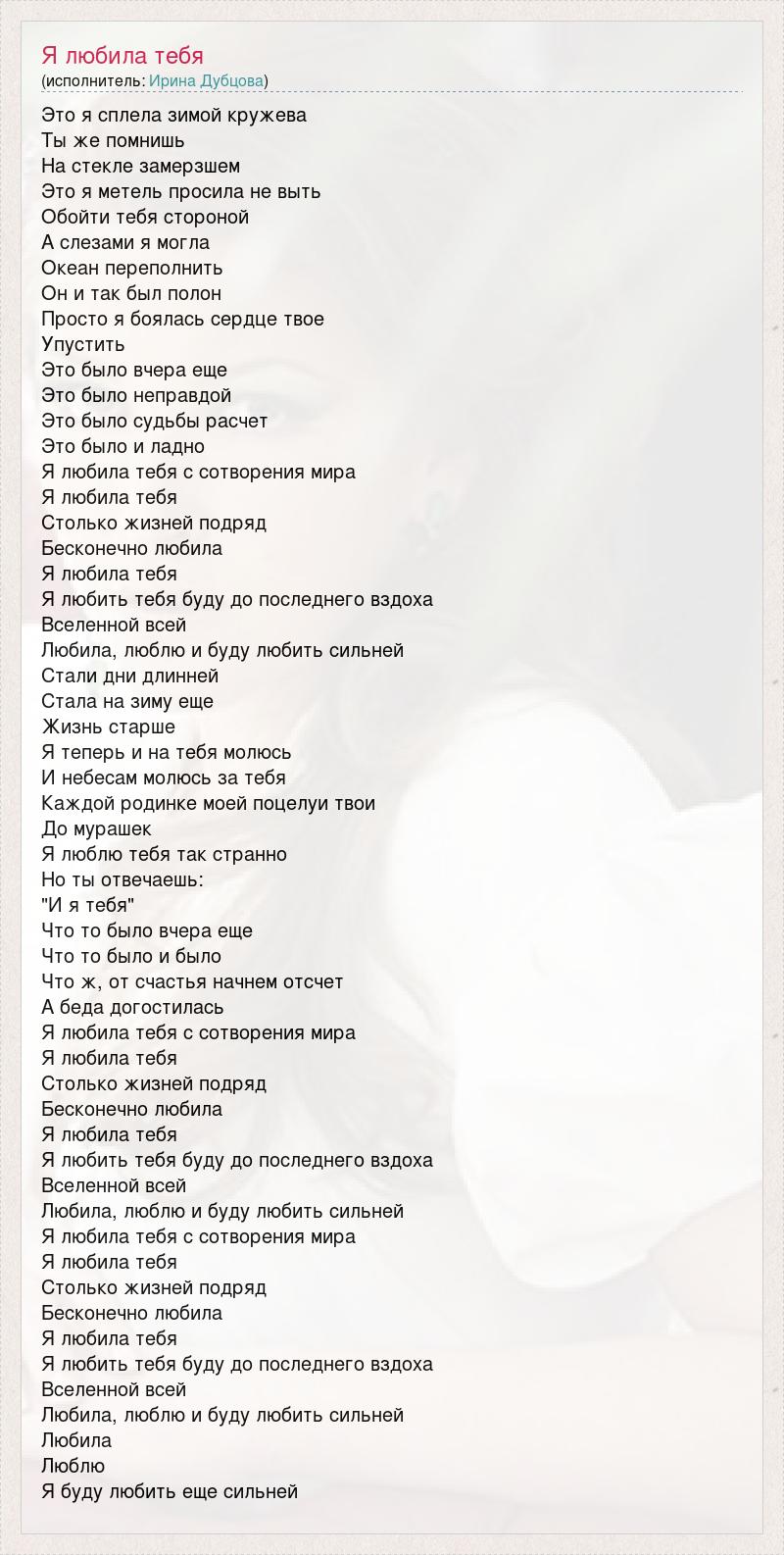 Это я сплела зимой кружева Ты же помнишь На стекле замерзшем Это я метель просила не выть Обойти тебя стороной А слезами я могла Океан переполнить Он и так был полон Просто я боялась сердце твое Упустить Это было вчера еще Это было неправдой Это было судьбы расчет Это было и ладно Я любила тебя с сотворения мира Я любила тебя Столько жизней подряд Бесконечно любила Я любила тебя Я любить тебя буду до последнего вздоха Вселенной всей Любила, люблю и буду любить сильней Стали дни длинней Стала на зиму еще Жизнь старше Я теперь и на тебя молюсь И небесам молюсь за тебя Каждой родинке моей поцелуи твои До мурашек Я люблю тебя так странно Но ты отвечаешь: "И я тебя" Что то было вчера еще Что то было и было Что ж, от счастья начнем отсчет А беда догостилась Я любила тебя с сотворения мира Я любила тебя Столько жизней подряд Бесконечно любила Я любила тебя Я любить тебя буду до последнего вздоха Вселенной всей Любила, люблю и буду любить сильней Я любила тебя с сотворения мира Я любила тебя Столько жизней подряд Бесконечно любила Я любила тебя Я любить тебя буду до последнего вздоха Вселенной всей Любила, люблю и буду любить сильней Любила Люблю Я буду любить еще сильней