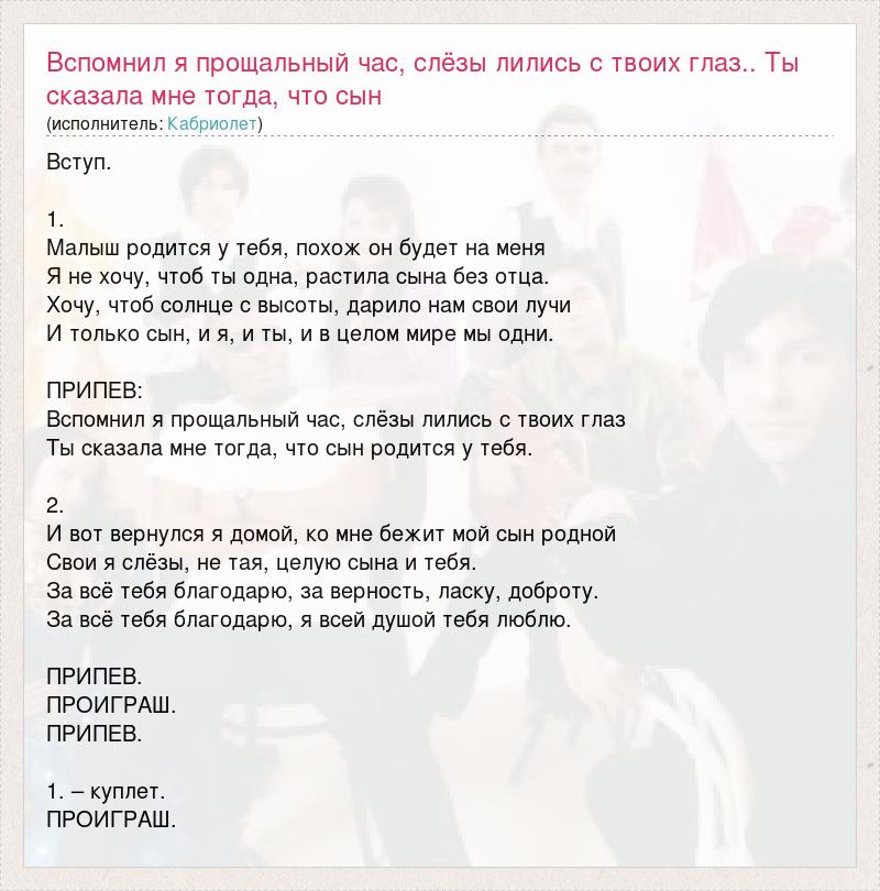 Вступ. 1. Малыш родится у тебя, похож он будет на меня Я не хочу, чтоб ты одна, растила сына без отца. Хочу, чтоб солнце с высоты, дарило нам свои лучи И только сын, и я, и ты, и в целом мире мы одни. ПРИПЕВ: Вспомнил я прощальный час, слёзы лились с твоих глаз Ты сказала мне тогда, что сын родится у тебя. 2. И вот вернулся я домой, ко мне бежит мой сын родной Свои я слёзы, не тая, целую сына и тебя. За всё тебя благодарю, за верность, ласку, доброту. За всё тебя благодарю, я всей душой тебя люблю. ПРИПЕВ. ПРОИГРАШ. ПРИПЕВ. 1. – куплет. ПРОИГРАШ.
