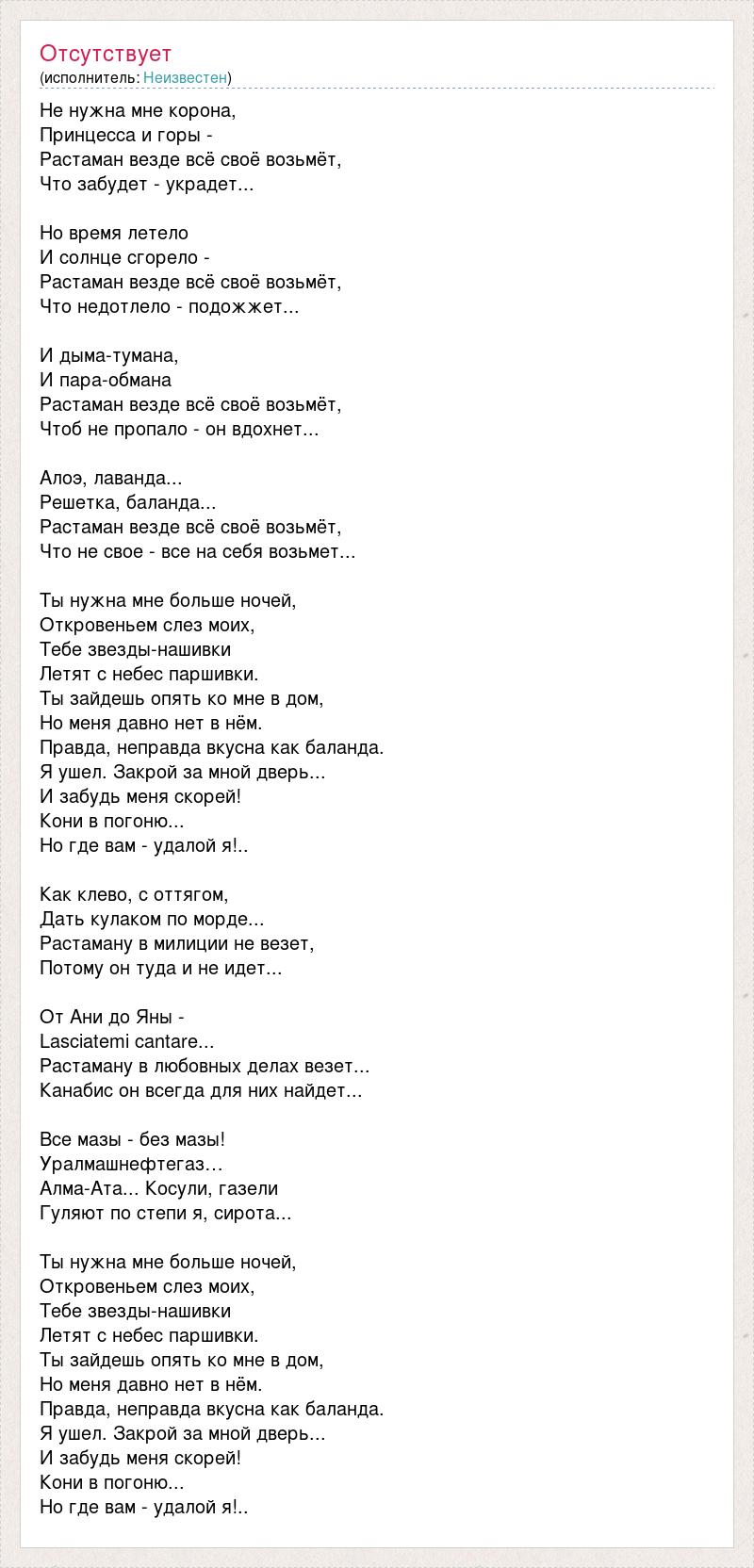 Не нужна мне корона, Принцесса и горы - Растаман везде всё своё возьмёт, Что забудет - украдет... Но время летело И солнце сгорело - Растаман везде всё своё возьмёт, Что недотлело - подожжет... И дыма-тумана, И пара-обмана Растаман везде всё своё возьмёт, Чтоб не пропало - он вдохнет... Алоэ, лаванда... Решетка, баланда... Растаман везде всё своё возьмёт, Что не свое - все на себя возьмет... Ты нужна мне больше ночей, Откровеньем слез моих, Тебе звезды-нашивки Летят с небес паршивки. Ты зайдешь опять ко мне в дом, Но меня давно нет в нём. Правда, неправда вкусна как баланда. Я ушел. Закрой за мной дверь... И забудь меня скорей! Кони в погоню... Но где вам - удалой я!.. Как клево, с оттягом, Дать кулаком по морде... Растаману в милиции не везет, Потому он туда и не идет... От Ани до Яны - Lasciatemi cantare... Растаману в любовных делах везет... Канабис он всегда для них найдет... Все мазы - без мазы! Уралмашнефтегаз… Алма-Ата... Косули, газели Гуляют по степи я, сирота... Ты нужна мне больше ночей, Откровеньем слез моих, Тебе звезды-нашивки Летят с небес паршивки. Ты зайдешь опять ко мне в дом, Но меня давно нет в нём. Правда, неправда вкусна как баланда. Я ушел. Закрой за мной дверь... И забудь меня скорей! Кони в погоню... Но где вам - удалой я!..