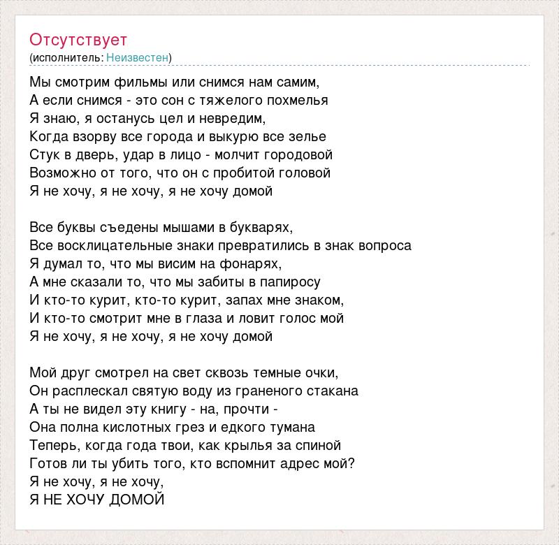 Мы смотрим фильмы или снимся нам самим, А если снимся - это сон с тяжелого похмелья Я знаю, я останусь цел и невредим, Когда взорву все города и выкурю все зелье Стук в дверь, удар в лицо - молчит городовой Возможно от того, что он с пробитой головой Я не хочу, я не хочу, я не хочу домой Все буквы съедены мышами в букварях, Все восклицательные знаки превратились в знак вопроса Я думал то, что мы висим на фонарях, А мне сказали то, что мы забиты в папиросу И кто-то курит, кто-то курит, запах мне знаком, И кто-то смотрит мне в глаза и ловит голос мой Я не хочу, я не хочу, я не хочу домой Мой друг смотрел на свет сквозь темные очки, Он расплескал святую воду из граненого стакана А ты не видел эту книгу - на, прочти - Она полна кислотных грез и едкого тумана Теперь, когда года твои, как крылья за спиной Готов ли ты убить того, кто вспомнит адрес мой? Я не хочу, я не хочу, Я НЕ ХОЧУ ДОМОЙ