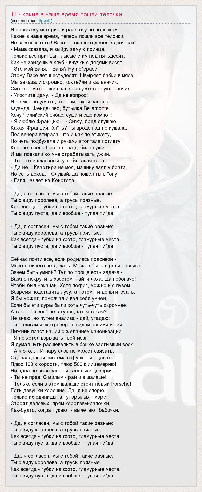 Я расскажу историю и разложу по полочкам, Какие в наше время, теперь пошли все тёлочки. Не важно кто ты! Важно - сколько денег в джинсах! - Мама сказала, я выйду замуж принца. Только все принцы - лысые и им под пятьдесят. Как не зайдешь в клуб - внучки с дядями висят. - Это мой Ваня. - Ваня? Ну не*ерасе! Этому Васе лет шестьдесят. Швыряет бабки в мясе. Мы заказали скромно: коктейли и кальянчик. Смотрю, матрешки возле нас уже танцуют танчик. - Угостите даму. - Да не вопрос! Я не мог подумать, что там такой запрос... Фуанда, Фендеклер, бутылка Bellamonte. Хочу Чилийский сибас, суши и еще компот! - Я люблю Францию... - Сижу, бред слушаю... Какая Франция, бл*ть? Ты вроде год не кушала. Пол вечера втирала, что и как по этикету, Но чуть подбухала и руками втоптала котлету. Короче, очень быстро она добила суши, И мы поехали ко мне отрабатывать ужин. - Ты такой классный, у тебя такая хата... - Да не... Квартира не моя, машину взял у брата, Но есть доход. - Слушай, да пошел ты в *опу! - Галя, 20 лет из Конотопа. - Да, я согласен, мы с тобой такие разные: Ты с виду королева, а трусы грязные. Как всегда - губки на фото, гламурные места. Ты с виду пуста, да и вообще - тупая пи*да! - Да, я согласен, мы с тобой такие разные: Ты с виду королева, а трусы грязные. Как всегда - губки на фото, гламурные места. Ты с виду пуста, да и вообще - тупая пи*да! Сейчас почти все, если родилась красивой - Можно ничего не делать. Можно быть в роли пассива. Зачем быть умной? Тут по проще есть задача - Важно покрутить хвостом, найти лоха. Да побогаче! Чтобы был накачан. Хотя пофиг, можно и с пузом. Вовремя подставить лузу, а потом - и деньги юзать. Я бы может, помолчал и вел себя умней, Если бы эти дуры были хоть чуть-чуть скромнее. А так: - Ты вообще в курсе, кто я такая? Не знаю, но путем анализа - дай, угадаю: Ты полигам и экстраверт с видом ассимиляции, Нижний пласт нации с желанием канонизации. - Я не хотел взрывать твой мозг, Я думал чуть расшевелить в бошке застывший воск. - А я это... - И пару слов не может связать. Однозадачная система с функцей - давать! Плюс 100 к корости, плюс 500 к лицемерию! Ни одна не вызывает ни капельки доверия. - Ты не прав! С милым - рай и в шалаше! - Только если в этом шалаше стоит новый Porsche! Есть девушки хорошие. Да, я не спорю. Только их единицы, а тупорылых - море! Строят деловых, прям королевы-лапочки, Как-будто, когда пукают - вылетают бабочки. - Да, я согласен, мы с тобой такие разные: Ты с виду королева, а трусы грязные. Как всегда - губки на фото, гламурные места. Ты с виду пуста, да и вообще - тупая пи*да! - Да, я согласен, мы с тобой такие разные: Ты с виду королева, а трусы грязные. Как всегда - губки на фото, гламурные места. Ты с виду пуста, да и вообще - тупая пи*да!