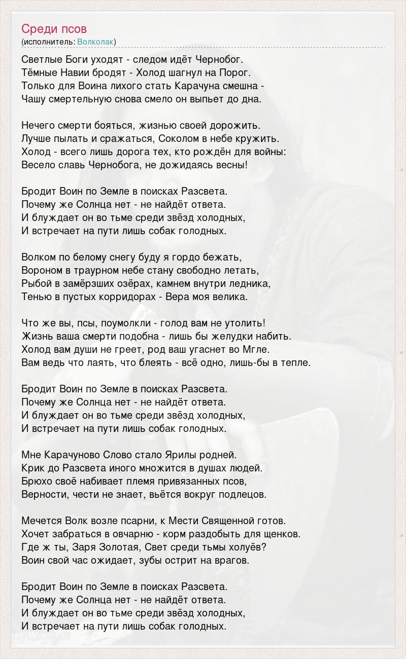 Светлые Боги уходят - следом идёт Чернобог. Тёмные Навии бродят - Холод шагнул на Порог. Только для Воина лихого стать Карачуна смешна - Чашу смертельную снова смело он выпьет до дна. Нечего смерти бояться, жизнью своей дорожить. Лучше пылать и сражаться, Соколом в небе кружить. Холод - всего лишь дорога тех, кто рождён для войны: Весело славь Чернобога, не дожидаясь весны! Бродит Воин по Земле в поисках Разсвета. Почему же Солнца нет - не найдёт ответа. И блуждает он во тьме среди звёзд холодных, И встречает на пути лишь собак голодных. Волком по белому снегу буду я гордо бежать, Вороном в траурном небе стану свободно летать, Рыбой в замёрзших озёрах, камнем внутри ледника, Тенью в пустых корридорах - Вера моя велика. Что же вы, псы, поумолкли - голод вам не утолить! Жизнь ваша смерти подобна - лишь бы желудки набить. Холод вам души не греет, род ваш угаснет во Мгле. Вам ведь что лаять, что блеять - всё одно, лишь-бы в тепле. Бродит Воин по Земле в поисках Разсвета. Почему же Солнца нет - не найдёт ответа. И блуждает он во тьме среди звёзд холодных, И встречает на пути лишь собак голодных. Мне Карачуново Слово стало Ярилы родней. Крик до Разсвета иного множится в душах людей. Брюхо своё набивает племя привязанных псов, Верности, чести не знает, вьётся вокруг подлецов. Мечется Волк возле псарни, к Мести Священной готов. Хочет забраться в овчарню - корм раздобыть для щенков. Где ж ты, Заря Золотая, Свет среди тьмы холуёв? Воин свой час ожидает, зубы острит на врагов. Бродит Воин по Земле в поисках Разсвета. Почему же Солнца нет - не найдёт ответа. И блуждает он во тьме среди звёзд холодных, И встречает на пути лишь собак голодных.