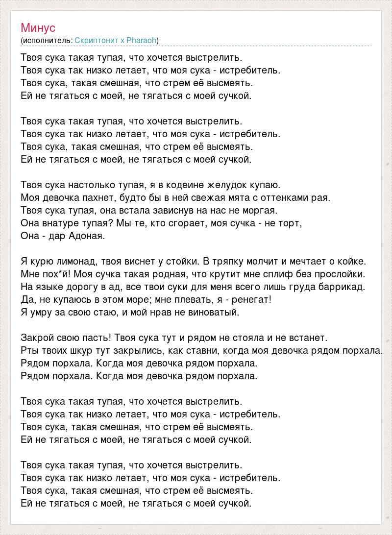 Твоя сука такая тупая, что хочется выстрелить. Твоя сука так низко летает, что моя сука - истребитель. Твоя сука, такая смешная, что стрем её высмеять. Ей не тягаться с моей, не тягаться с моей сучкой. Твоя сука такая тупая, что хочется выстрелить. Твоя сука так низко летает, что моя сука - истребитель. Твоя сука, такая смешная, что стрем её высмеять. Ей не тягаться с моей, не тягаться с моей сучкой. Твоя сука настолько тупая, я в кодеине желудок купаю. Моя девочка пахнет, будто бы в ней свежая мята с оттенками рая. Твоя сука тупая, она встала зависнув на нас не моргая. Она внатуре тупая? Мы те, кто сгорает, моя сучка - не торт, Она - дар Адоная. Я курю лимонад, твоя виснет у стойки. В тряпку молчит и мечтает о койке. Мне пох*й! Моя сучка такая родная, что крутит мне сплиф без прослойки. На языке дорогу в ад, все твои суки для меня всего лишь груда баррикад. Да, не купаюсь в этом море; мне плевать, я - ренегат! Я умру за свою стаю, и мой нрав не виноватый. Закрой свою пасть! Твоя сука тут и рядом не стояла и не встанет. Рты твоих шкур тут закрылись, как ставни, когда моя девочка рядом порхала. Рядом порхала. Когда моя девочка рядом порхала. Рядом порхала. Когда моя девочка рядом порхала. Твоя сука такая тупая, что хочется выстрелить. Твоя сука так низко летает, что моя сука - истребитель. Твоя сука, такая смешная, что стрем её высмеять. Ей не тягаться с моей, не тягаться с моей сучкой. Твоя сука такая тупая, что хочется выстрелить. Твоя сука так низко летает, что моя сука - истребитель. Твоя сука, такая смешная, что стрем её высмеять. Ей не тягаться с моей, не тягаться с моей сучкой.