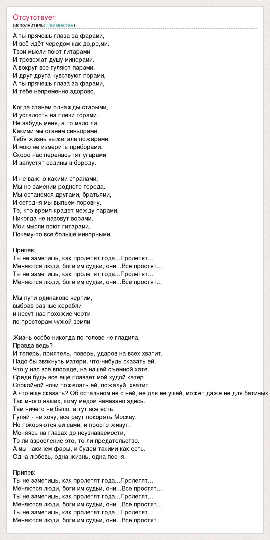 А ты прячешь глаза за фарами, И всё идёт чередом как до,ре,ми. Твои мысли поют гитарами И тревожат душу минорами. А вокруг все гуляют парами, И друг друга чувствуют порами, А ты прячешь глаза за фарами, И тебе непременно здорово. Когда станем однажды старыми, И усталость на плечи горами. Не забудь меня, а то мало ли, Какими мы станем синьорами. Тебя жизнь выжигала пожарами, И мою не измерить приборами. Скоро нас перенасытят угарами И запустят седины в бороду. И не важно какими странами, Мы не заменим родного города. Мы останемся другами, братьями, И сегодня мы выпьем поровну. Те, кто время крадет между парами, Никогда не назовут ворами. Мои мысли поют гитарами, Почему-то все больше минорными. Припев: Ты не заметишь, как пролетят года...Пролетят... Меняются люди, боги им судьи, они...Все простят... Ты не заметишь, как пролетят года...Пролетят... Меняются люди, боги им судьи, они...Все простят... Мы пути одинаково чертим, выбрав разные корабли и несут нас похожие черти по просторам чужой земли Жизнь особо никогда по голове не гладила, Правда ведь? И теперь, приятель, поверь, ударов на всех хватит, Надо бы звякнуть матери, что-нибудь сказать ей. Что у нас все впоряде, на нашей съемной хате. Среди будь все еще плавает мой худой катер. Спокойной ночи пожелать ей, пожалуй, хватит. А что еще сказать? Об остальном не с ней, не для ее ушей, может даже не для батиных. Так много наших, кому медом намазано здесь. Там ничего не было, а тут все есть. Гуляй - не хочу, все рвут покорять Москву. Но покоряются ей сами, и просто живут. Меняясь на глазах до неузнаваемости, То ли взросление это, то ли предательство. А мы накинем фары, и будем такими как есть. Одна любовь, одна жизнь, одна песня. Припев: Ты не заметишь, как пролетят года...Пролетят... Меняются люди, боги им судьи, они...Все простят... Ты не заметишь, как пролетят года...Пролетят... Меняются люди, боги им судьи, они...Все простят... Ты не заметишь, как пролетят года...Пролетят... Меняются люди, боги им судьи, они...Все простят...