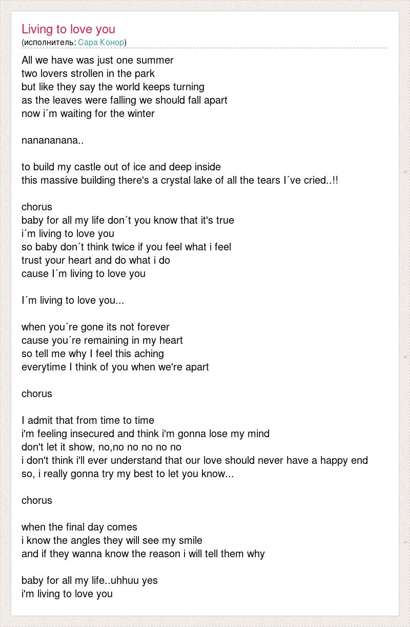 All we have was just one summer two lovers strollen in the park but like they say the world keeps turning as the leaves were falling we should fall apart now i´m waiting for the winter nanananana.. to build my castle out of ice and deep inside this massive building there's a crystal lake of all the tears I´ve cried..!! chorus baby for all my life don´t you know that it's true i´m living to love you so baby don´t think twice if you feel what i feel trust your heart and do what i do cause I´m living to love you I´m living to love you... when you´re gone its not forever cause you´re remaining in my heart so tell me why I feel this aching everytime I think of you when we're apart chorus I admit that from time to time i'm feeling insecured and think i'm gonna lose my mind don't let it show, no,no no no no no i don't think i'll ever understand that our love should never have a happy end so, i really gonna try my best to let you know... chorus when the final day comes i know the angles they will see my smile and if they wanna know the reason i will tell them why baby for all my life..uhhuu yes i'm living to love you
