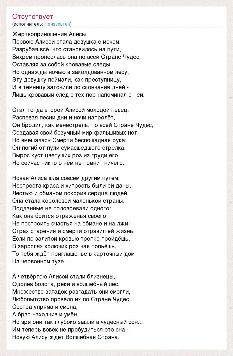 Жертвоприношения Алисы Первою Алисой стала девушка с мечом. Разрубая всё, что становилось на пути, Вихрем пронеслась она по всей Стране Чудес, Оставляя за собой кровавые следы. Но однажды ночью в заколдованном лесу, Эту девушку поймали, как преступницу, И в темницу заточили до скончания дней - Лишь кровавый след с тех пор напоминал о ней. Стал тогда второй Алисой молодой певец. Распевая песни дни и ночи напролёт, Он бродил, как менестрель, по всей Стране Чудес, Создавая свой безумный мир фальшивых нот. Но вмешалась Смерти беспощадная рука: Он погиб от пули сумасшедшего стрелка. Вырос куст цветущих роз из груди его… Но сейчас никто о нём не помнит ничего. Новая Алиса шла совсем другим путём: Неспроста краса и хитрость были ей даны. Лестью и обманом покорив сердца людей, Она стала королевой маленькой страны. Подданные не подозревали одного: Как она боится отраженья своего! Не построить счастья на обмане и на лжи: Страх старения и смерти отравил ей жизнь. Если по залитой кровью тропке пройдёшь, В зарослях колючих роз чая попьёшь, То тебя ждёт приглашенье в карточный дом На червонном тузе... А четвёртою Алисой стали близнецы, Одолев болота, реки и волшебный лес, Множество загадок разгадать они смогли, Любопытство провело их по Стране Чудес, Сестра упряма и смела, А брат находчив и умён, Но зря они так глубоко зашли в чудесный сон... Им теперь вовек не пробудиться ото сна - Новую Алису ждёт Волшебная Страна.