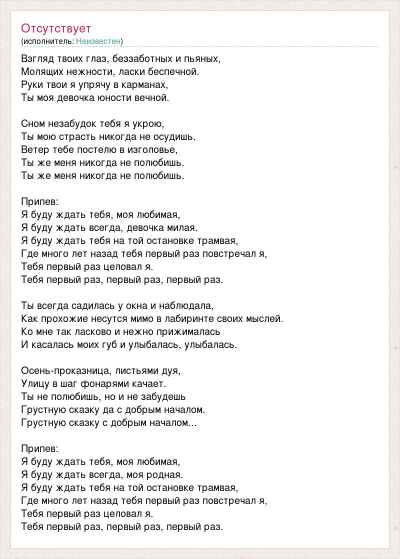 Взгляд твоих глаз, беззаботных и пьяных, Молящих нежности, ласки беспечной. Руки твои я упрячу в карманах, Ты моя девочка юности вечной. Сном незабудок тебя я укрою, Ты мою страсть никогда не осудишь. Ветер тебе постелю в изголовье, Ты же меня никогда не полюбишь. Ты же меня никогда не полюбишь. Припев: Я буду ждать тебя, моя любимая, Я буду ждать всегда, девочка милая. Я буду ждать тебя на той остановке трамвая, Где много лет назад тебя первый раз повстречал я, Тебя первый раз целовал я. Тебя первый раз, первый раз, первый раз. Ты всегда садилась у окна и наблюдала, Как прохожие несутся мимо в лабиринте своих мыслей. Ко мне так ласково и нежно прижималась И касалась моих губ и улыбалась, улыбалась. Осень-проказница, листьями дуя, Улицу в шаг фонарями качает. Ты не полюбишь, но и не забудешь Грустную сказку да с добрым началом. Грустную сказку с добрым началом... Припев: Я буду ждать тебя, моя любимая, Я буду ждать всегда, моя родная. Я буду ждать тебя на той остановке трамвая, Где много лет назад тебя первый раз повстречал я, Тебя первый раз целовал я. Тебя первый раз, первый раз, первый раз.