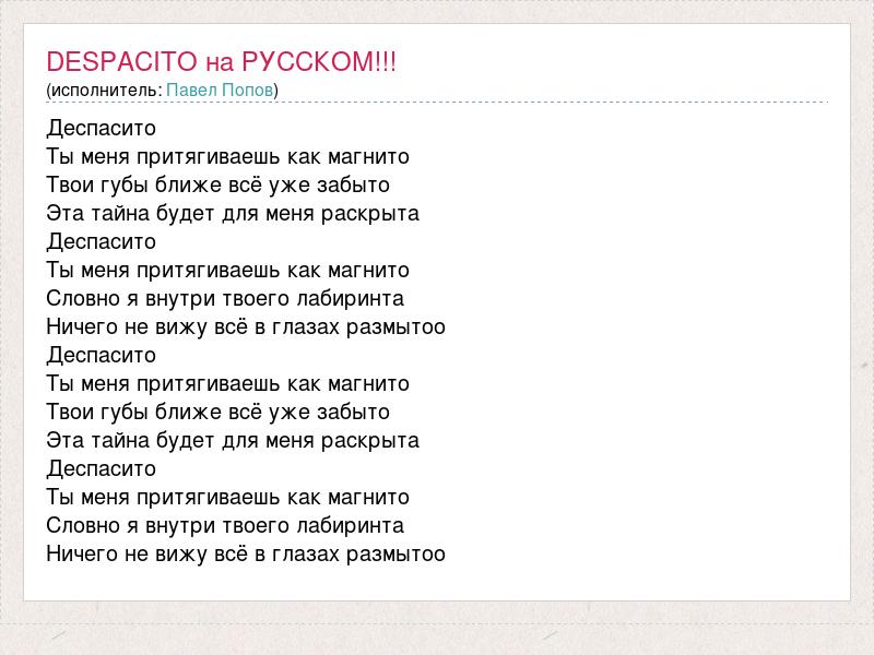 Деспасито Ты меня притягиваешь как магнито Твои губы ближе всё уже забыто Эта тайна будет для меня раскрыта Деспасито Ты меня притягиваешь как магнито Словно я внутри твоего лабиринта Ничего не вижу всё в глазах размытоо Деспасито Ты меня притягиваешь как магнито Твои губы ближе всё уже забыто Эта тайна будет для меня раскрыта Деспасито Ты меня притягиваешь как магнито Словно я внутри твоего лабиринта Ничего не вижу всё в глазах размытоо