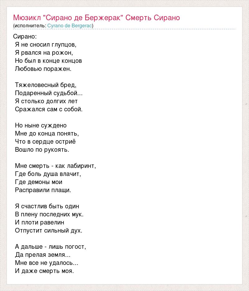 Сирано: Я не сносил глупцов, Я рвался на рожон, Но был в конце концов Любовью поражен. Тяжеловесный бред, Подаренный судьбой... Я столько долгих лет Сражался сам с собой. Но ныне суждено Мне до конца понять, Что в сердце остриё Вошло по рукоять. Мне смерть - как лабиринт, Где боль душа влачит, Где демоны мои Расправили плащи. Я счастлив быть один В плену последних мук. И плоти равелин Отпустит сильный дух. А дальше - лишь погост, Да прелая земля... Мне все не удалось... И даже смерть моя.
