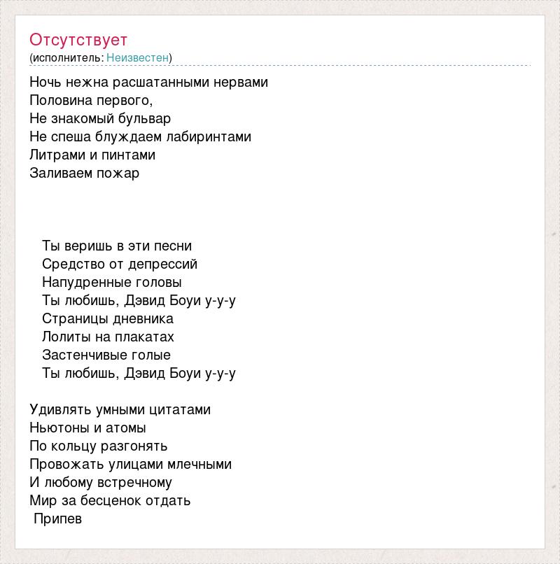 Ночь нежна расшатанными нервами Половина первого, Не знакомый бульвар Не спеша блуждаем лабиринтами Литрами и пинтами Заливаем пожар Ты веришь в эти песни Средство от депрессий Напудренные головы Ты любишь, Дэвид Боуи у-у-у Страницы дневника Лолиты на плакатах Застенчивые голые Ты любишь, Дэвид Боуи у-у-у Удивлять умными цитатами Ньютоны и атомы По кольцу разгонять Провожать улицами млечными И любому встречному Мир за бесценок отдать Припев