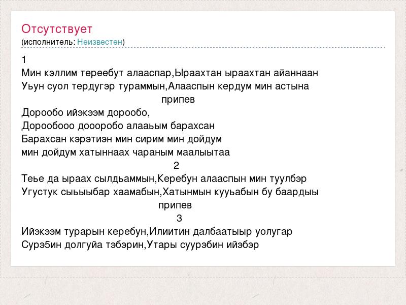 Мин кэллим тереебут алааспар,Ыраахтан ыраахтан айаннаан