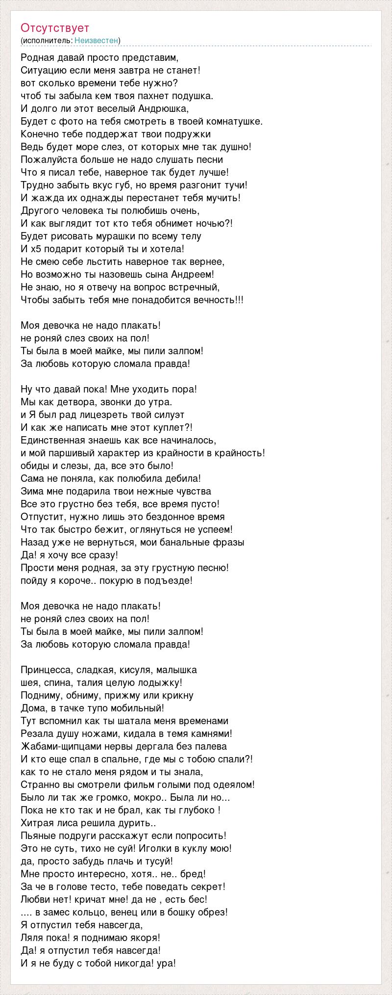 Родная давай просто представим, Ситуацию если меня завтра не станет! вот сколько времени тебе нужно? чтоб ты забыла кем твоя пахнет подушка. И долго ли этот веселый Андрюшка, Будет с фото на тебя смотреть в твоей комнатушке. Конечно тебе поддержат твои подружки Ведь будет море слез, от которых мне так душно! Пожалуйста больше не надо слушать песни Что я писал тебе, наверное так будет лучше! Трудно забыть вкус губ, но время разгонит тучи! И жажда их однажды перестанет тебя мучить! Другого человека ты полюбишь очень, И как выглядит тот кто тебя обнимет ночью?! Будет рисовать мурашки по всему телу И х5 подарит который ты и хотела! Не смею себе льстить наверное так вернее, Но возможно ты назовешь сына Андреем! Не знаю, но я отвечу на вопрос встречный, Чтобы забыть тебя мне понадобится вечность!!! Моя девочка не надо плакать! не роняй слез своих на пол! Ты была в моей майке, мы пили залпом! За любовь которую сломала правда! Ну что давай пока! Мне уходить пора! Мы как детвора, звонки до утра. и Я был рад лицезреть твой силуэт И как же написать мне этот куплет?! Единственная знаешь как все начиналось, и мой паршивый характер из крайности в крайность! обиды и слезы, да, все это было! Сама не поняла, как полюбила дебила! Зима мне подарила твои нежные чувства Все это грустно без тебя, все время пусто! Отпустит, нужно лишь это бездонное время Что так быстро бежит, оглянуться не успеем! Назад уже не вернуться, мои банальные фразы Да! я хочу все сразу! Прости меня родная, за эту грустную песню! пойду я короче.. покурю в подъезде! Моя девочка не надо плакать! не роняй слез своих на пол! Ты была в моей майке, мы пили залпом! За любовь которую сломала правда! Принцесса, сладкая, кисуля, малышка шея, спина, талия целую лодыжку! Подниму, обниму, прижму или крикну Дома, в тачке тупо мобильный! Тут вспомнил как ты шатала меня временами Резала душу ножами, кидала в темя камнями! Жабами-щипцами нервы дергала без палева И кто еще спал в спальне, где мы с тобою спали?! как то не стало меня рядом и ты знала, Странно вы смотрели фильм голыми под одеялом! Было ли так же громко, мокро.. Была ли но... Пока не кто так и не брал, как ты глубоко ! Хитрая лиса решила дурить.. Пьяные подруги расскажут если попросить! Это не суть, тихо не суй! Иголки в куклу мою! да, просто забудь плачь и тусуй! Мне просто интересно, хотя.. не.. бред! За че в голове тесто, тебе поведать секрет! Любви нет! кричат мне! да не , есть бес! .... в замес кольцо, венец или в бошку обрез! Я отпустил тебя навсегда, Ляля пока! я поднимаю якоря! Да! я отпустил тебя навсегда! И я не буду с тобой никогда! ура!