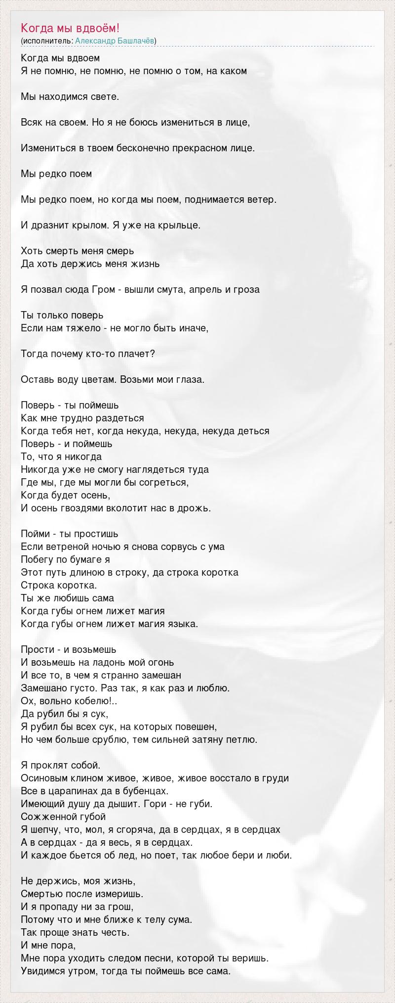 Когда мы вдвоем Я не помню, не помню, не помню о том, на каком Мы находимся свете. Всяк на своем. Но я не боюсь измениться в лице, Измениться в твоем бесконечно прекрасном лице. Мы редко поем Мы редко поем, но когда мы поем, поднимается ветер. И дразнит крылом. Я уже на крыльце. Хоть смерть меня смерь Да хоть держись меня жизнь Я позвал сюда Гром - вышли смута, апрель и гроза Ты только поверь Если нам тяжело - не могло быть иначе, Тогда почему кто-то плачет? Оставь воду цветам. Возьми мои глаза. Поверь - ты поймешь Как мне трудно раздеться Когда тебя нет, когда некуда, некуда, некуда деться Поверь - и поймешь То, что я никогда Никогда уже не смогу наглядеться туда Где мы, где мы могли бы согреться, Когда будет осень, И осень гвоздями вколотит нас в дрожь. Пойми - ты простишь Если ветреной ночью я снова сорвусь с ума Побегу по бумаге я Этот путь длиною в строку, да строка коротка Строка коротка. Ты же любишь сама Когда губы огнем лижет магия Когда губы огнем лижет магия языка. Прости - и возьмешь И возьмешь на ладонь мой огонь И все то, в чем я странно замешан Замешано густо. Раз так, я как раз и люблю. Ох, вольно кобелю!.. Да рубил бы я сук, Я рубил бы всех сук, на которых повешен, Но чем больше срублю, тем сильней затяну петлю. Я проклят собой. Осиновым клином живое, живое, живое восстало в груди Все в царапинах да в бубенцах. Имеющий душу да дышит. Гори - не губи. Сожженной губой Я шепчу, что, мол, я сгоряча, да в сердцах, я в сердцах А в сердцах - да я весь, я в сердцах. И каждое бьется об лед, но поет, так любое бери и люби. Не держись, моя жизнь, Смертью после измеришь. И я пропаду ни за грош, Потому что и мне ближе к телу сума. Так проще знать честь. И мне пора, Мне пора уходить следом песни, которой ты веришь. Увидимся утром, тогда ты поймешь все сама.