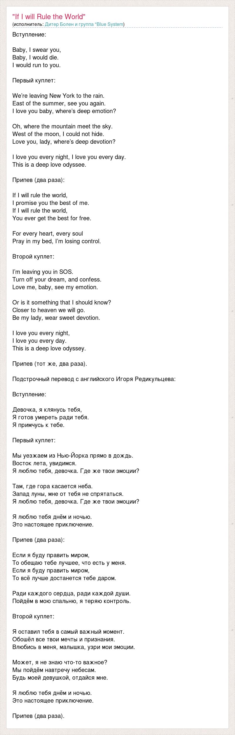 Вступление: Baby, I swear you, Baby, I would die. I would run to you. Первый куплет: We’re leaving New York to the rain. East of the summer, see you again. I love you baby, where’s deep emotion? Oh, where the mountain meet the sky. West of the moon, I could not hide. Love you, lady, where’s deep devotion? I love you every night, I love you every day. This is a deep love odyssee. Припев (два раза): If I will rule the world, I promise you the best of me. If I will rule the world, You ever get the best for free. For every heart, every soul Pray in my bed, I’m losing control. Второй куплет: I’m leaving you in SOS. Turn off your dream, and confess. Love me, baby, see my emotion. Or is it something that I should know? Closer to heaven we will go. Be my lady, wear sweet devotion. I love you every night, I love you every day. This is a deep love odyssey. Припев (тот же, два раза). Подстрочный перевод с английского Игоря Редикульцева: Вступление: Девочка, я клянусь тебя, Я готов умереть ради тебя. Я примчусь к тебе. Первый куплет: Мы уезжаем из Нью-Йорка прямо в дождь. Восток лета, увидимся. Я люблю тебя, девочка. Где же твои эмоции? Там, где гора касается неба. Запад луны, мне от тебя не спрятаться. Я люблю тебя, девочка. Где же твои эмоции? Я люблю тебя днём и ночью. Это настоящее приключение. Припев (два раза): Если я буду править миром, То обещаю тебе лучшее, что есть у меня. Если я буду править миром, То всё лучше достанется тебе даром. Ради каждого сердца, ради каждой души. Пойдём в мою спальню, я теряю контроль. Второй куплет: Я оставил тебя в самый важный момент. Обошёл все твои мечты и признания. Влюбись в меня, малышка, узри мои эмоции. Может, я не знаю что-то важное? Мы пойдём навтречу небесам. Будь моей девушкой, отдайся мне. Я люблю тебя днём и ночью. Это настоящее приключение. Припев (два раза).
