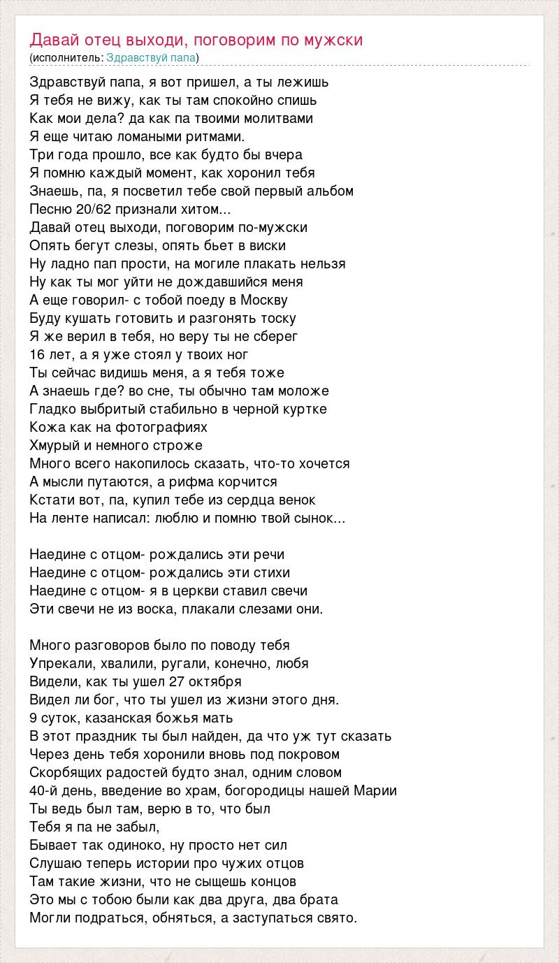 Здравствуй папа, я вот пришел, а ты лежишь Я тебя не вижу, как ты там спокойно спишь Как мои дела? да как па твоими молитвами Я еще читаю ломаными ритмами. Три года прошло, все как будто бы вчера Я помню каждый момент, как хоронил тебя Знаешь, па, я посветил тебе свой первый альбом Песню 20/62 признали хитом... Давай отец выходи, поговорим по-мужски Опять бегут слезы, опять бьет в виски Ну ладно пап прости, на могиле плакать нельзя Ну как ты мог уйти не дождавшийся меня А еще говорил- с тобой поеду в Москву Буду кушать готовить и разгонять тоску Я же верил в тебя, но веру ты не сберег 16 лет, а я уже стоял у твоих ног Ты сейчас видишь меня, а я тебя тоже А знаешь где? во сне, ты обычно там моложе Гладко выбритый стабильно в черной куртке Кожа как на фотографиях Хмурый и немного строже Много всего накопилось сказать, что-то хочется А мысли путаются, а рифма корчится Кстати вот, па, купил тебе из сердца венок На ленте написал: люблю и помню твой сынок... Наедине с отцом- рождались эти речи Наедине с отцом- рождались эти стихи Наедине с отцом- я в церкви ставил свечи Эти свечи не из воска, плакали слезами они. Много разговоров было по поводу тебя Упрекали, хвалили, ругали, конечно, любя Видели, как ты ушел 27 октября Видел ли бог, что ты ушел из жизни этого дня. 9 суток, казанская божья мать В этот праздник ты был найден, да что уж тут сказать Через день тебя хоронили вновь под покровом Скорбящих радостей будто знал, одним словом 40-й день, введение во храм, богородицы нашей Марии Ты ведь был там, верю в то, что был Тебя я па не забыл, Бывает так одиноко, ну просто нет сил Слушаю теперь истории про чужих отцов Там такие жизни, что не сыщешь концов Это мы с тобою были как два друга, два брата Могли подраться, обняться, а заступаться свято.