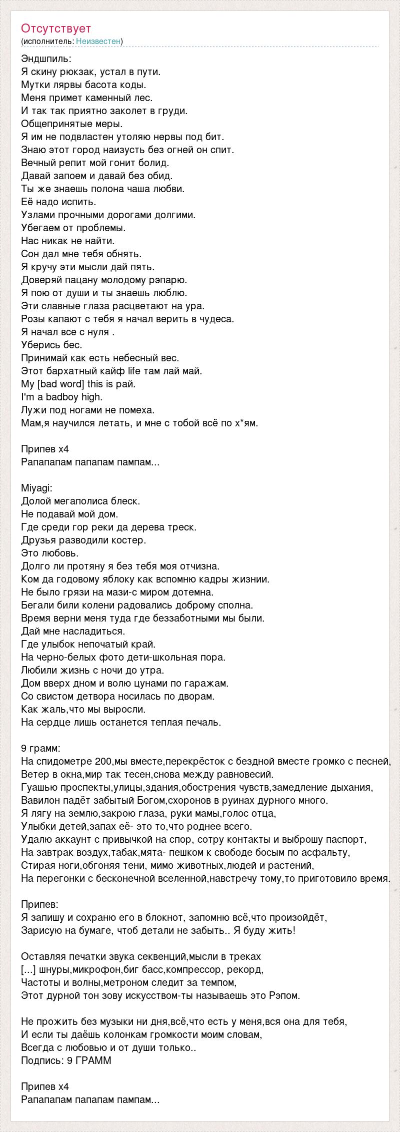 Эндшпиль: Я скину рюкзак, устал в пути. Мутки лярвы басота коды. Меня примет каменный лес. И так так приятно заколет в груди. Общепринятые меры. Я им не подвластен утоляю нервы под бит. Знаю этот город наизусть без огней он спит. Вечный репит мой гонит болид. Давай запоем и давай без обид. Ты же знаешь полона чаша любви. Её надо испить. Узлами прочными дорогами долгими. Убегаем от проблемы. Нас никак не найти. Сон дал мне тебя обнять. Я кручу эти мысли дай пять. Доверяй пацану молодому рэпарю. Я пою от души и ты знаешь люблю. Эти славные глаза расцветают на ура. Розы капают с тебя я начал верить в чудеса. Я начал все с нуля . Уберись бес. Принимай как есть небесный вес. Этот бархатный кайф life там лай май. My [bad word] this is рай. I'm a badboy high. Лужи под ногами не помеха. Мам,я научился летать, и мне с тобой всё по х*ям. Припев x4 Рапапапам папапам пампам... Miyagi: Долой мегаполиса блеск. Не подавай мой дом. Где среди гор реки да дерева треск. Друзья разводили костер. Это любовь. Долго ли протяну я без тебя моя отчизна. Ком да годовому яблоку как вспомню кадры жизнии. Не было грязи на мази-с миром дотемна. Бегали били колени радовались доброму сполна. Время верни меня туда где беззаботными мы были. Дай мне насладиться. Где улыбок непочатый край. На черно-белых фото дети-школьная пора. Любили жизнь с ночи до утра. Дом вверх дном и волю цунами по гаражам. Со свистом детвора носилась по дворам. Как жаль,что мы выросли. На сердце лишь останется теплая печаль. 9 грамм: На спидометре 200,мы вместе,перекрёсток с бездной вместе громко с песней, Ветер в окна,мир так тесен,снова между равновесий. Гуашью проспекты,улицы,здания,обострения чувств,замедление дыхания, Вавилон падёт забытый Богом,схоронов в руинах дурного много. Я лягу на землю,закрою глаза, руки мамы,голос отца, Улыбки детей,запах её- это то,что роднее всего. Удалю аккаунт с привычкой на спор, сотру контакты и выброшу паспорт, На завтрак воздух,табак,мята- пешком к свободе босым по асфальту, Стирая ноги,обгоняя тени, мимо животных,людей и растений, На перегонки с бесконечной вселенной,навстречу тому,то приготовило время. Припев: Я запишу и сохраню его в блокнот, запомню всё,что произойдёт, Зарисую на бумаге, чтоб детали не забыть.. Я буду жить! Оставляя печатки звука секвенций,мысли в треках [...] шнуры,микрофон,биг басс,компрессор, рекорд, Частоты и волны,метроном следит за темпом, Этот дурной тон зову искусством-ты называешь это Рэпом. Не прожить без музыки ни дня,всё,что есть у меня,вся она для тебя, И если ты даёшь колонкам громкости моим словам, Всегда с любовью и от души только.. Подпись: 9 ГРАММ Припев x4 Рапапапам папапам пампам...