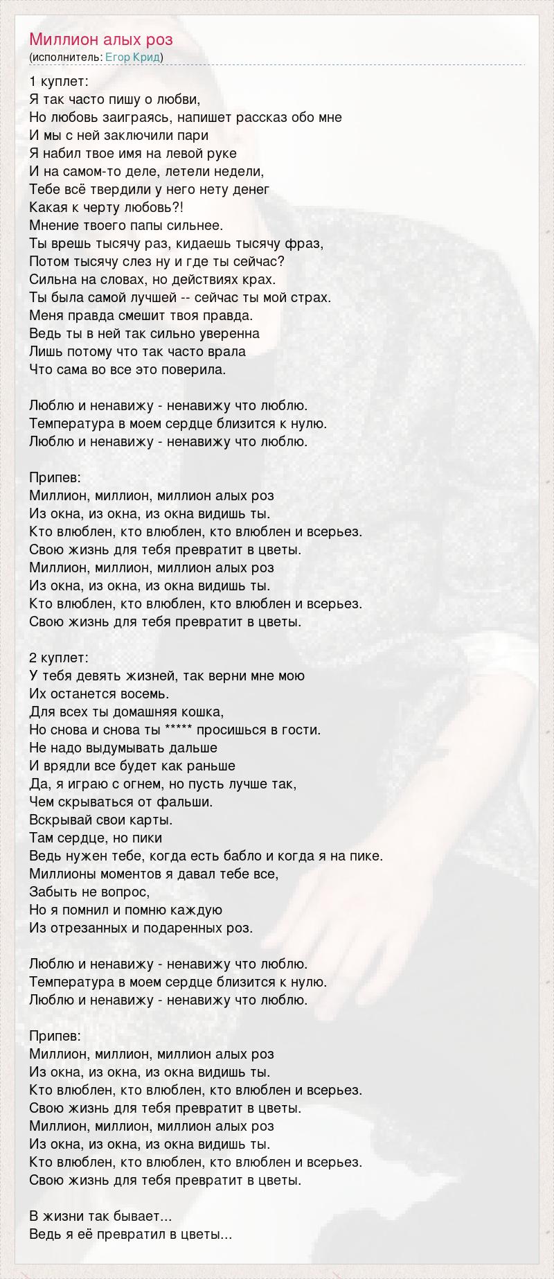 1 куплет: Я так часто пишу о любви, Но любовь заиграясь, напишет рассказ обо мне И мы с ней заключили пари Я набил твое имя на левой руке И на самом-то деле, летели недели, Тебе всё твердили у него нету денег Какая к черту любовь?! Мнение твоего папы сильнее. Ты врешь тысячу раз, кидаешь тысячу фраз, Потом тысячу слез ну и где ты сейчас? Сильна на словах, но действиях крах. Ты была самой лучшей -- сейчас ты мой страх. Меня правда смешит твоя правда. Ведь ты в ней так сильно уверенна Лишь потому что так часто врала Что сама во все это поверила. Люблю и ненавижу - ненавижу что люблю. Температура в моем сердце близится к нулю. Люблю и ненавижу - ненавижу что люблю. Припев: Миллион, миллион, миллион алых роз Из окна, из окна, из окна видишь ты. Кто влюблен, кто влюблен, кто влюблен и всерьез. Свою жизнь для тебя превратит в цветы. Миллион, миллион, миллион алых роз Из окна, из окна, из окна видишь ты. Кто влюблен, кто влюблен, кто влюблен и всерьез. Свою жизнь для тебя превратит в цветы. 2 куплет: У тебя девять жизней, так верни мне мою Их останется восемь. Для всех ты домашняя кошка, Но снова и снова ты ***** просишься в гости. Не надо выдумывать дальше И врядли все будет как раньше Да, я играю с огнем, но пусть лучше так, Чем скрываться от фальши. Вскрывай свои карты. Там сердце, но пики Ведь нужен тебе, когда есть бабло и когда я на пике. Миллионы моментов я давал тебе все, Забыть не вопрос, Но я помнил и помню каждую Из отрезанных и подаренных роз. Люблю и ненавижу - ненавижу что люблю. Температура в моем сердце близится к нулю. Люблю и ненавижу - ненавижу что люблю. Припев: Миллион, миллион, миллион алых роз Из окна, из окна, из окна видишь ты. Кто влюблен, кто влюблен, кто влюблен и всерьез. Свою жизнь для тебя превратит в цветы. Миллион, миллион, миллион алых роз Из окна, из окна, из окна видишь ты. Кто влюблен, кто влюблен, кто влюблен и всерьез. Свою жизнь для тебя превратит в цветы. В жизни так бывает... Ведь я её превратил в цветы...