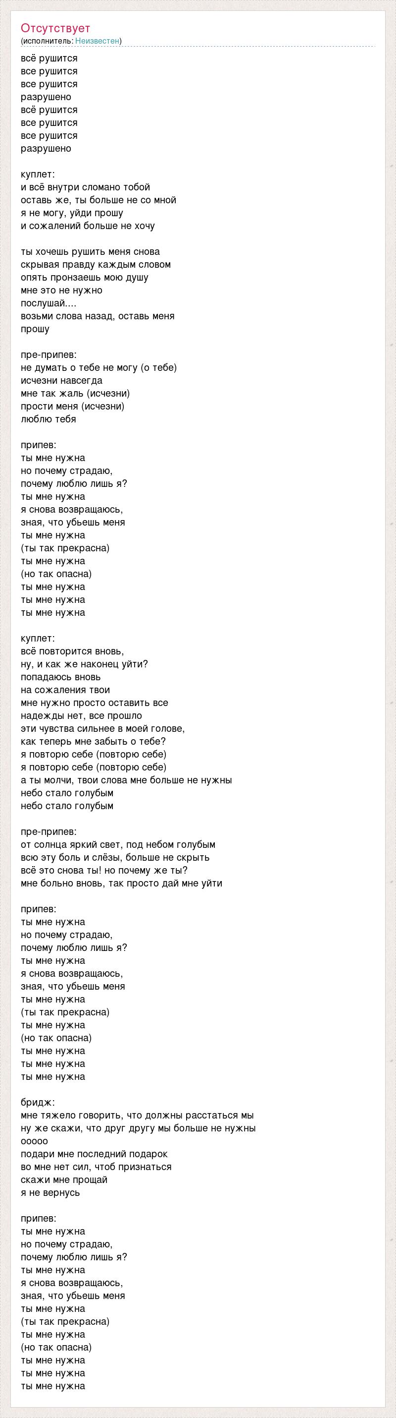 всё рушится все рушится все рушится разрушено всё рушится все рушится все рушится разрушено куплет: и всё внутри сломано тобой оставь же, ты больше не со мной я не могу, уйди прошу и сожалений больше не хочу ты хочешь рушить меня снова скрывая правду каждым словом опять пронзаешь мою душу мне это не нужно послушай.... возьми слова назад, оставь меня прошу пре-припев: не думать о тебе не могу (о тебе) исчезни навсегда мне так жаль (исчезни) прости меня (исчезни) люблю тебя припев: ты мне нужна но почему страдаю, почему люблю лишь я? ты мне нужна я снова возвращаюсь, зная, что убьешь меня ты мне нужна (ты так прекрасна) ты мне нужна (но так опасна) ты мне нужна ты мне нужна ты мне нужна куплет: всё повторится вновь, ну, и как же наконец уйти? попадаюсь вновь на сожаления твои мне нужно просто оставить все надежды нет, все прошло эти чувства сильнее в моей голове, как теперь мне забыть о тебе? я повторю себе (повторю себе) я повторю себе (повторю себе) а ты молчи, твои слова мне больше не нужны небо стало голубым небо стало голубым пре-припев: от солнца яркий свет, под небом голубым всю эту боль и слёзы, больше не скрыть всё это снова ты! но почему же ты? мне больно вновь, так просто дай мне уйти припев: ты мне нужна но почему страдаю, почему люблю лишь я? ты мне нужна я снова возвращаюсь, зная, что убьешь меня ты мне нужна (ты так прекрасна) ты мне нужна (но так опасна) ты мне нужна ты мне нужна ты мне нужна бридж: мне тяжело говорить, что должны расстаться мы ну же скажи, что друг другу мы больше не нужны ооооо подари мне последний подарок во мне нет сил, чтоб признаться скажи мне прощай я не вернусь припев: ты мне нужна но почему страдаю, почему люблю лишь я? ты мне нужна я снова возвращаюсь, зная, что убьешь меня ты мне нужна (ты так прекрасна) ты мне нужна (но так опасна) ты мне нужна ты мне нужна ты мне нужна