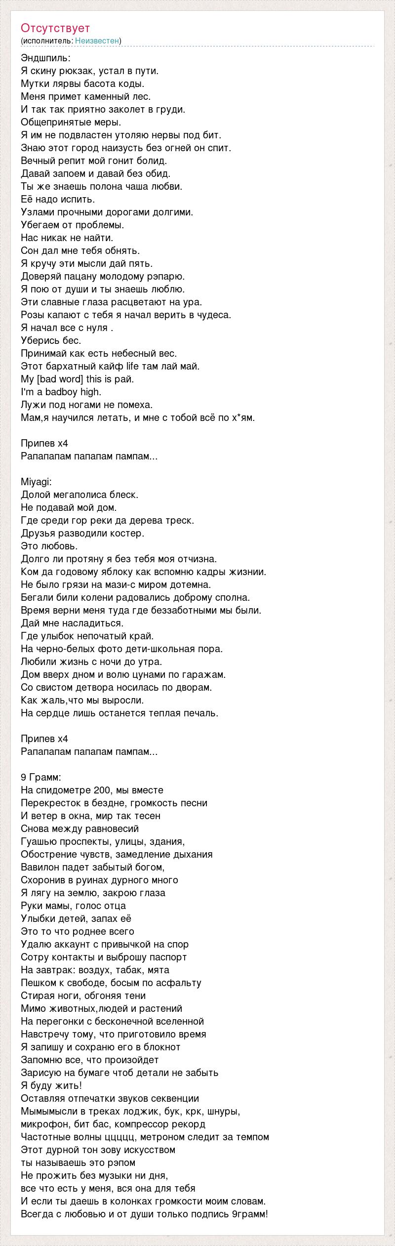 Эндшпиль: Я скину рюкзак, устал в пути. Мутки лярвы басота коды. Меня примет каменный лес. И так так приятно заколет в груди. Общепринятые меры. Я им не подвластен утоляю нервы под бит. Знаю этот город наизусть без огней он спит. Вечный репит мой гонит болид. Давай запоем и давай без обид. Ты же знаешь полона чаша любви. Её надо испить. Узлами прочными дорогами долгими. Убегаем от проблемы. Нас никак не найти. Сон дал мне тебя обнять. Я кручу эти мысли дай пять. Доверяй пацану молодому рэпарю. Я пою от души и ты знаешь люблю. Эти славные глаза расцветают на ура. Розы капают с тебя я начал верить в чудеса. Я начал все с нуля . Уберись бес. Принимай как есть небесный вес. Этот бархатный кайф life там лай май. My [bad word] this is рай. I'm a badboy high. Лужи под ногами не помеха. Мам,я научился летать, и мне с тобой всё по х*ям. Припев x4 Рапапапам папапам пампам... Miyagi: Долой мегаполиса блеск. Не подавай мой дом. Где среди гор реки да дерева треск. Друзья разводили костер. Это любовь. Долго ли протяну я без тебя моя отчизна. Ком да годовому яблоку как вспомню кадры жизнии. Не было грязи на мази-с миром дотемна. Бегали били колени радовались доброму сполна. Время верни меня туда где беззаботными мы были. Дай мне насладиться. Где улыбок непочатый край. На черно-белых фото дети-школьная пора. Любили жизнь с ночи до утра. Дом вверх дном и волю цунами по гаражам. Со свистом детвора носилась по дворам. Как жаль,что мы выросли. На сердце лишь останется теплая печаль. Припев x4 Рапапапам папапам пампам... 9 Грамм: На спидометре 200, мы вместе Перекресток в бездне, громкость песни И ветер в окна, мир так тесен Снова между равновесий Гуашью проспекты, улицы, здания, Обострение чувств, замедление дыхания Вавилон падет забытый богом, Схоронив в руинах дурного много Я лягу на землю, закрою глаза Руки мамы, голос отца Улыбки детей, запах её Это то что роднее всего Удалю аккаунт с привычкой на спор Сотру контакты и выброшу паспорт На завтрак: воздух, табак, мята Пешком к свободе, босым по асфальту Стирая ноги, обгоняя тени Мимо животных,людей и растений На перегонки с бесконечной вселенной Навстречу тому, что приготовило время Я запишу и сохраню его в блокнот Запомню все, что произойдет Зарисую на бумаге чтоб детали не забыть Я буду жить! Оставляя отпечатки звуков секвенции Мымымысли в треках лоджик, бук, крк, шнуры, микрофон, бит бас, компрессор рекорд Частотные волны ццццц, метроном следит за темпом Этот дурной тон зову искусством ты называешь это рэпом Не прожить без музыки ни дня, все что есть у меня, вся она для тебя И если ты даешь в колонках громкости моим словам. Всегда с любовью и от души только подпись 9грамм!