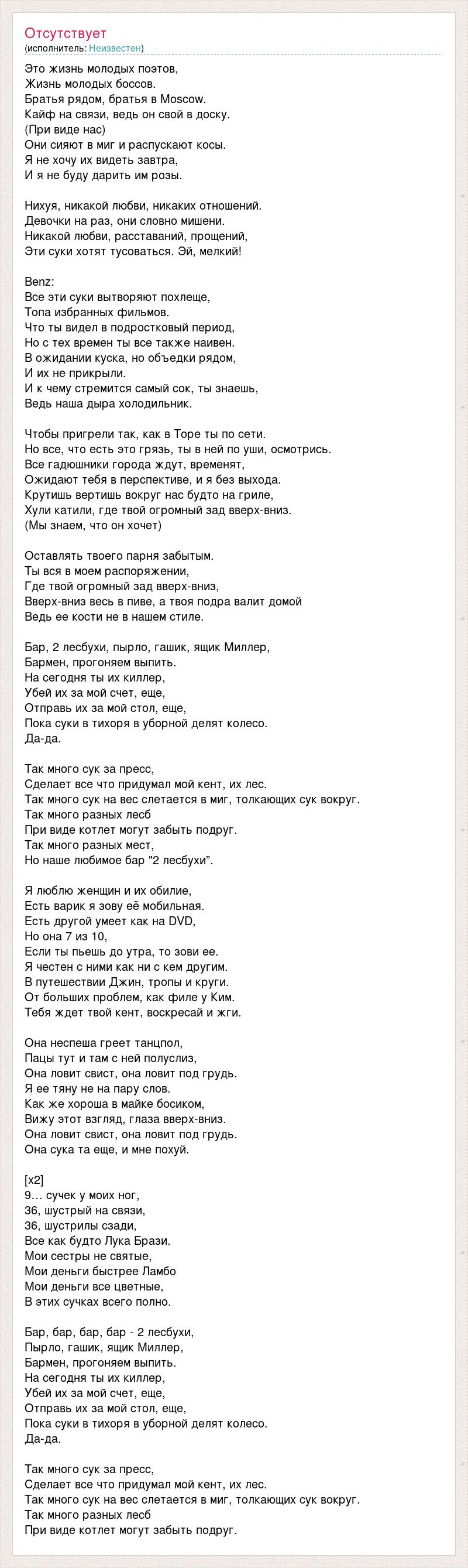 Это жизнь молодых поэтов, Жизнь молодых боссов. Братья рядом, братья в Moscow. Кайф на связи, ведь он свой в доску. (При виде нас) Они сияют в миг и распускают косы. Я не хочу их видеть завтра, И я не буду дарить им розы. Нихуя, никакой любви, никаких отношений. Девочки на раз, они словно мишени. Никакой любви, расставаний, прощений, Эти суки хотят тусоваться. Эй, мелкий! Benz: Все эти суки вытворяют похлеще, Топа избранных фильмов. Что ты видел в подростковый период, Но с тех времен ты все также наивен. В ожидании куска, но объедки рядом, И их не прикрыли. И к чему стремится самый сок, ты знаешь, Ведь наша дыра холодильник. Чтобы пригрели так, как в Торе ты по сети. Но все, что есть это грязь, ты в ней по уши, осмотрись. Все гадюшники города ждут, временят, Ожидают тебя в перспективе, и я без выхода. Крутишь вертишь вокруг нас будто на гриле, Хули катили, где твой огромный зад вверх-вниз. (Мы знаем, что он хочет) Оставлять твоего парня забытым. Ты вся в моем распоряжении, Где твой огромный зад вверх-вниз, Вверх-вниз весь в пиве, а твоя подра валит домой Ведь ее кости не в нашем стиле. Бар, 2 лесбухи, пырло, гашик, ящик Миллер, Бармен, прогоняем выпить. На сегодня ты их киллер, Убей их за мой счет, еще, Отправь их за мой стол, еще, Пока суки в тихоря в уборной делят колесо. Да-да. Так много сук за пресс, Сделает все что придумал мой кент, их лес. Так много сук на вес слетается в миг, толкающих сук вокруг. Так много разных лесб При виде котлет могут забыть подруг. Так много разных мест, Но наше любимое бар "2 лесбухи”. Я люблю женщин и их обилие, Есть варик я зову её мобильная. Есть другой умеет как на DVD, Но она 7 из 10, Если ты пьешь до утра, то зови ее. Я честен с ними как ни с кем другим. В путешествии Джин, тропы и круги. От больших проблем, как филе у Ким. Тебя ждет твой кент, воскресай и жги. Она неспеша греет танцпол, Пацы тут и там с ней полуслиз, Она ловит свист, она ловит под грудь. Я ее тяну не на пару слов. Как же хороша в майке босиком, Вижу этот взгляд, глаза вверх-вниз. Она ловит свист, она ловит под грудь. Она сука та еще, и мне похуй. [х2] 9… сучек у моих ног, 36, шустрый на связи, 36, шустрилы сзади, Все как будто Лука Брази. Мои сестры не святые, Мои деньги быстрее Ламбо Мои деньги все цветные, В этих сучках всего полно. Бар, бар, бар, бар - 2 лесбухи, Пырло, гашик, ящик Миллер, Бармен, прогоняем выпить. На сегодня ты их киллер, Убей их за мой счет, еще, Отправь их за мой стол, еще, Пока суки в тихоря в уборной делят колесо. Да-да. Так много сук за пресс, Сделает все что придумал мой кент, их лес. Так много сук на вес слетается в миг, толкающих сук вокруг. Так много разных лесб При виде котлет могут забыть подруг.