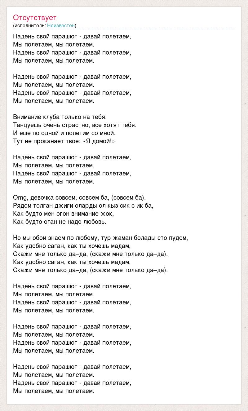 Надень свой парашют - давай полетаем, Мы полетаем, мы полетаем. Надень свой парашют - давай полетаем, Мы полетаем, мы полетаем. Надень свой парашют - давай полетаем, Мы полетаем, мы полетаем. Надень свой парашют - давай полетаем, Мы полетаем, мы полетаем. Внимание клуба только на тебя. Танцуешь очень страстно, все хотят тебя. И еще по одной и полетим со мной. Тут не проканает твое: «Я домой!» Надень свой парашют - давай полетаем, Мы полетаем, мы полетаем. Надень свой парашют - давай полетаем, Мы полетаем, мы полетаем. Оmg, девочка совсем, совсем ба, (совсем ба). Рядом толган джиги оларды ол кыз сик с ик ба, Как будто мен огон внимание жок, Как будто оган не надо любовь. Но мы обои знаем по любому, тур жаман болады сто пудом, Как удобно саган, как ты хочешь мадам, Скажи мне только да–да, (скажи мне только да–да). Как удобно саган, как ты хочешь мадам, Скажи мне только да–да, (скажи мне только да–да). Надень свой парашют - давай полетаем, Мы полетаем, мы полетаем. Надень свой парашют - давай полетаем, Мы полетаем, мы полетаем. Надень свой парашют - давай полетаем, Мы полетаем, мы полетаем. Надень свой парашют - давай полетаем, Мы полетаем, мы полетаем. Надень свой парашют - давай полетаем, Мы полетаем, мы полетаем. Надень свой парашют - давай полетаем, Мы полетаем, мы полетаем.