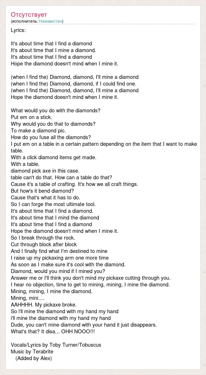 Lyrics: It's about time that I find a diamond It's about time that I mine a diamond. It's about time that I find a diamond Hope the diamond doesn't mind when I mine it. (when I find the) Diamond, diamond, I'll mine a diamond (when I find the) Diamond, diamond, if I could find one. (when I find the) Diamond, diamond, I'll mine a diamond Hope the diamond doesn't mind when I mine it. What would you do with the diamonds? Put em on a stick. Why would you do that to diamonds? To make a diamond pic. How do you fuse all the diamonds? I put em on a table in a certain pattern depending on the item that I want to make table. With a click diamond items get made. With a table. diamond pick axe in this case. table can't do that. How can a table do that? Cause it's a table of crafting. It's how we all craft things. But how's it bend diamond? Cause that's what it has to do. So I can forge the most ultimate tool. It's about time that I find a diamond. It's about time that I mind the diamond It's about time that I find a diamond Hope the diamond doesn't mind when I mine it. So I break through the rock. Cut through block after block And I finally find what I'm destined to mine I raise up my pickaxing arm one more time As soon as I make sure it's cool with the diamond. Diamond, would you mind if I mined you? Answer me or I'll think you don't mind my pickaxe cutting through you. I hear no objection, time to get to mining, mining, I mine the diamond. Mining, mining, I mine the diamond. Mining, mini.... AAHHHH. My pickaxe broke. So i'll mine the diamond with my hand my hand i'll mine the diamond with my hand my hand Dude, you can't mine diamond with your hand it just disappears. What's that? It disa... OHH NOOO!!! Vocals/Lyrics by Toby Turner/Tobuscus Music by Terabrite (Added by Alex)