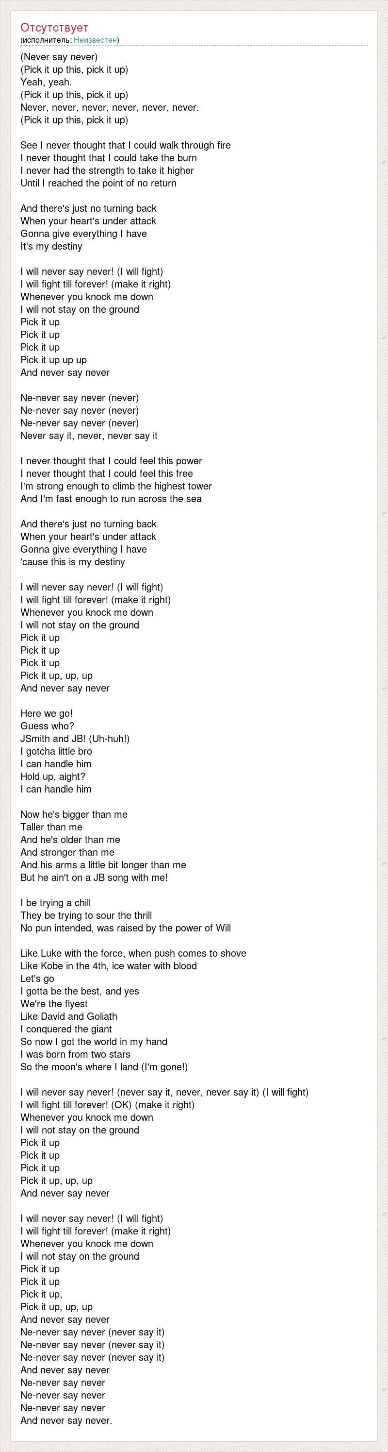 (Never say never) (Pick it up this, pick it up) Yeah, yeah. (Pick it up this, pick it up) Never, never, never, never, never, never. (Pick it up this, pick it up) See I never thought that I could walk through fire I never thought that I could take the burn I never had the strength to take it higher Until I reached the point of no return And there's just no turning back When your heart's under attack Gonna give everything I have It's my destiny I will never say never! (I will fight) I will fight till forever! (make it right) Whenever you knock me down I will not stay on the ground Pick it up Pick it up Pick it up Pick it up up up And never say never Ne-never say never (never) Ne-never say never (never) Ne-never say never (never) Never say it, never, never say it I never thought that I could feel this power I never thought that I could feel this free I'm strong enough to climb the highest tower And I'm fast enough to run across the sea And there's just no turning back When your heart's under attack Gonna give everything I have 'cause this is my destiny I will never say never! (I will fight) I will fight till forever! (make it right) Whenever you knock me down I will not stay on the ground Pick it up Pick it up Pick it up Pick it up, up, up And never say never Here we go! Guess who? JSmith and JB! (Uh-huh!) I gotcha little bro I can handle him Hold up, aight? I can handle him Now he's bigger than me Taller than me And he's older than me And stronger than me And his arms a little bit longer than me But he ain't on a JB song with me! I be trying a chill They be trying to sour the thrill No pun intended, was raised by the power of Will Like Luke with the force, when push comes to shove Like Kobe in the 4th, ice water with blood Let's go I gotta be the best, and yes We're the flyest Like David and Goliath I conquered the giant So now I got the world in my hand I was born from two stars So the moon's where I land (I'm gone!) I will never say never! (never say it, never, never say it) (I will fight) I will fight till forever! (OK) (make it right) Whenever you knock me down I will not stay on the ground Pick it up Pick it up Pick it up Pick it up, up, up And never say never I will never say never! (I will fight) I will fight till forever! (make it right) Whenever you knock me down I will not stay on the ground Pick it up Pick it up Pick it up, Pick it up, up, up And never say never Ne-never say never (never say it) Ne-never say never (never say it) Ne-never say never (never say it) And never say never Ne-never say never Ne-never say never Ne-never say never And never say never.