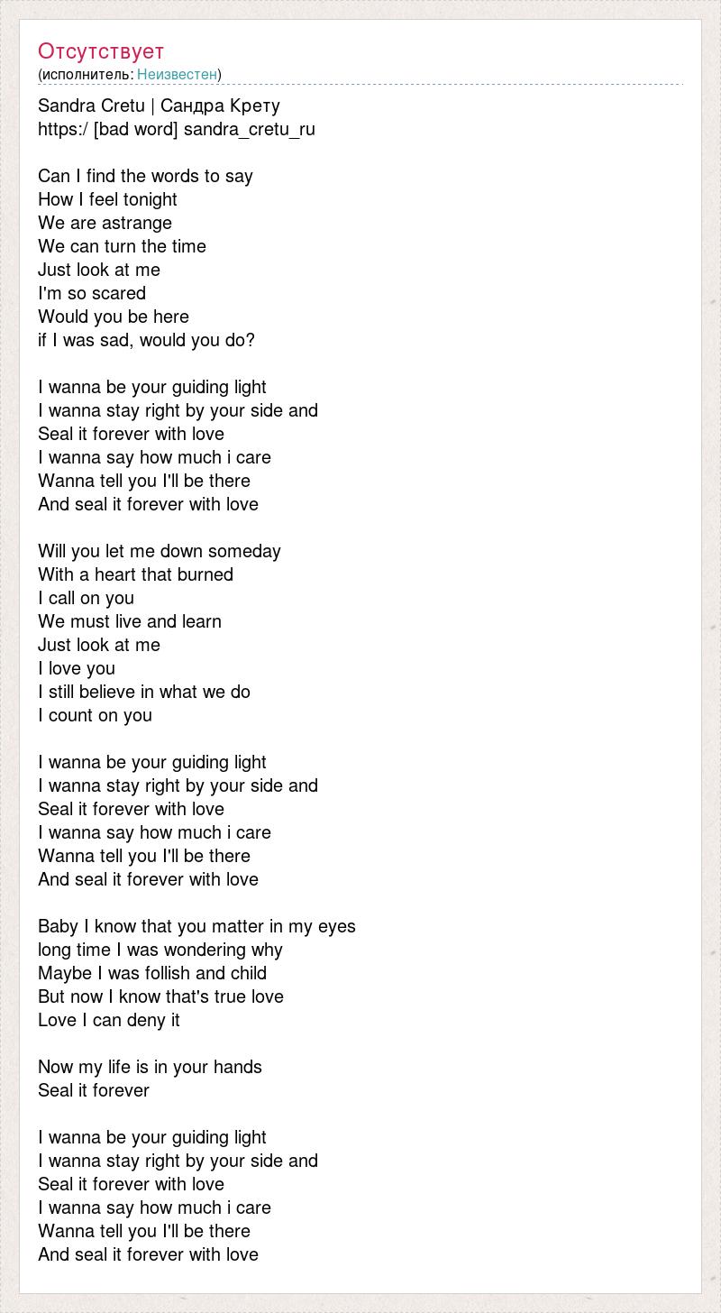 Sandra Cretu | Сандра Крету https:/ [bad word] sandra_cretu_ru Can I find the words to say How I feel tonight We are astrange We can turn the time Just look at me I'm so scared Would you be here if I was sad, would you do? I wanna be your guiding light I wanna stay right by your side and Seal it forever with love I wanna say how much i care Wanna tell you I'll be there And seal it forever with love Will you let me down someday With a heart that burned I call on you We must live and learn Just look at me I love you I still believe in what we do I count on you I wanna be your guiding light I wanna stay right by your side and Seal it forever with love I wanna say how much i care Wanna tell you I'll be there And seal it forever with love Baby I know that you matter in my eyes long time I was wondering why Maybe I was follish and child But now I know that's true love Love I can deny it Now my life is in your hands Seal it forever I wanna be your guiding light I wanna stay right by your side and Seal it forever with love I wanna say how much i care Wanna tell you I'll be there And seal it forever with love