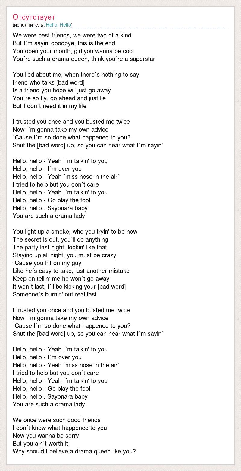 We were best friends, we were two of a kind But I´m sayin' goodbye, this is the end You open your mouth, girl you wanna be cool You´re such a drama queen, think you´re a superstar You lied about me, when there´s nothing to say friend who talks [bad word] Is a friend you hope will just go away You´re so fly, go ahead and just lie But I don´t need it in my life I trusted you once and you busted me twice Now I´m gonna take my own advice ´Cause I´m so done what happened to you? Shut the [bad word] up, so you can hear what I´m sayin´ Hello, hello - Yeah I´m talkin' to you Hello, hello - I´m over you Hello, hello - Yeah ´miss nose in the air´ I tried to help but you don´t care Hello, hello - Yeah I´m talkin' to you Hello, hello - Go play the fool Hello, hello . Sayonara baby You are such a drama lady You light up a smoke, who you tryin' to be now The secret is out, you´ll do anything The party last night, lookin' like that Staying up all night, you must be crazy ´Cause you hit on my guy Like he´s easy to take, just another mistake Keep on tellin' me he won´t go away It won´t last, I´ll be kicking your [bad word] Someone´s burnin' out real fast I trusted you once and you busted me twice Now I´m gonna take my own advice ´Cause I´m so done what happened to you? Shut the [bad word] up, so you can hear what I´m sayin´ Hello, hello - Yeah I´m talkin' to you Hello, hello - I´m over you Hello, hello - Yeah ´miss nose in the air´ I tried to help but you don´t care Hello, hello - Yeah I´m talkin' to you Hello, hello - Go play the fool Hello, hello . Sayonara baby You are such a drama lady We once were such good friends I don´t know what happened to you Now you wanna be sorry But you ain´t worth it Why should I believe a drama queen like you?