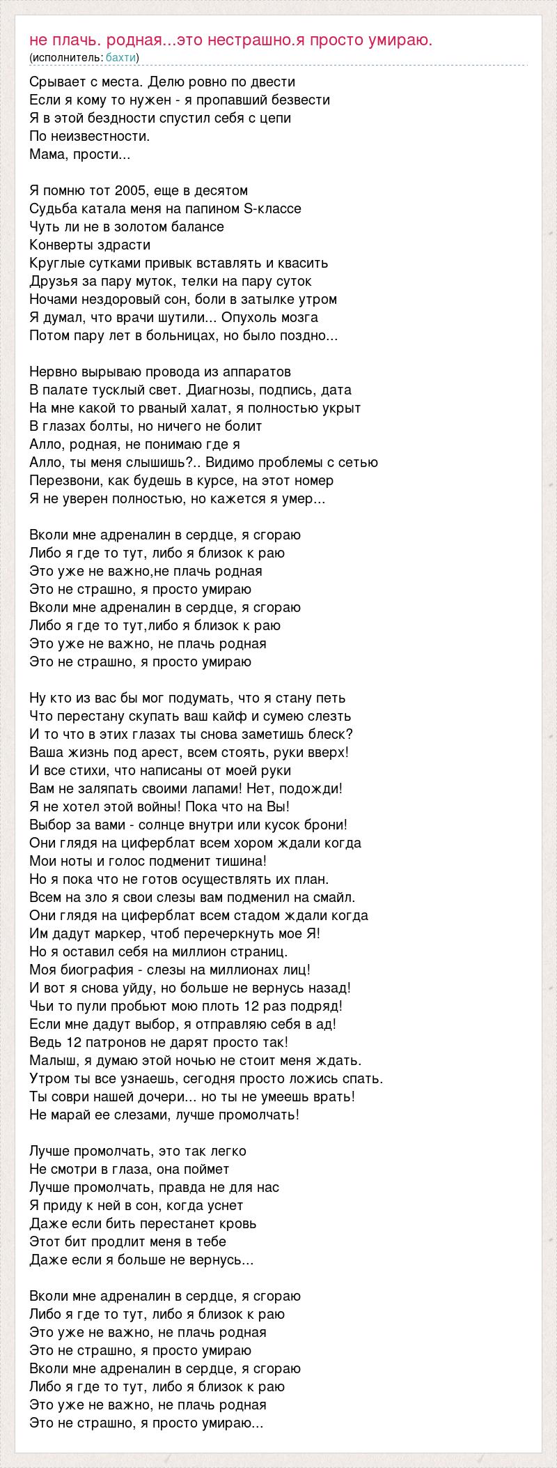 Срывает с места. Делю ровно по двести Если я кому то нужен - я пропавший безвести Я в этой бездности спустил себя с цепи По неизвестности. Мама, прости... Я помню тот 2005, еще в десятом Судьба катала меня на папином S-классе Чуть ли не в золотом балансе Конверты здрасти Круглые сутками привык вставлять и квасить Друзья за пару муток, телки на пару суток Ночами нездоровый сон, боли в затылке утром Я думал, что врачи шутили... Опухоль мозга Потом пару лет в больницах, но было поздно... Нервно вырываю провода из аппаратов В палате тусклый свет. Диагнозы, подпись, дата На мне какой то рваный халат, я полностью укрыт В глазах болты, но ничего не болит Алло, родная, не понимаю где я Алло, ты меня слышишь?.. Видимо проблемы с сетью Перезвони, как будешь в курсе, на этот номер Я не уверен полностью, но кажется я умер... Вколи мне адреналин в сердце, я сгораю Либо я где то тут, либо я близок к раю Это уже не важно,не плачь родная Это не страшно, я просто умираю Вколи мне адреналин в сердце, я сгораю Либо я где то тут,либо я близок к раю Это уже не важно, не плачь родная Это не страшно, я просто умираю Ну кто из вас бы мог подумать, что я стану петь Что перестану скупать ваш кайф и сумею слезть И то что в этих глазах ты снова заметишь блеск? Ваша жизнь под арест, всем стоять, руки вверх! И все стихи, что написаны от моей руки Вам не заляпать своими лапами! Нет, подожди! Я не хотел этой войны! Пока что на Вы! Выбор за вами - солнце внутри или кусок брони! Они глядя на циферблат всем хором ждали когда Мои ноты и голос подменит тишина! Но я пока что не готов осуществлять их план. Всем на зло я свои слезы вам подменил на смайл. Они глядя на циферблат всем стадом ждали когда Им дадут маркер, чтоб перечеркнуть мое Я! Но я оставил себя на миллион страниц. Моя биография - слезы на миллионах лиц! И вот я снова уйду, но больше не вернусь назад! Чьи то пули пробьют мою плоть 12 раз подряд! Если мне дадут выбор, я отправляю себя в ад! Ведь 12 патронов не дарят просто так! Малыш, я думаю этой ночью не стоит меня ждать. Утром ты все узнаешь, сегодня просто ложись спать. Ты соври нашей дочери... но ты не умеешь врать! Не марай ее слезами, лучше промолчать! Лучше промолчать, это так легко Не смотри в глаза, она поймет Лучше промолчать, правда не для нас Я приду к ней в сон, когда уснет Даже если бить перестанет кровь Этот бит продлит меня в тебе Даже если я больше не вернусь... Вколи мне адреналин в сердце, я сгораю Либо я где то тут, либо я близок к раю Это уже не важно, не плачь родная Это не страшно, я просто умираю Вколи мне адреналин в сердце, я сгораю Либо я где то тут, либо я близок к раю Это уже не важно, не плачь родная Это не страшно, я просто умираю...