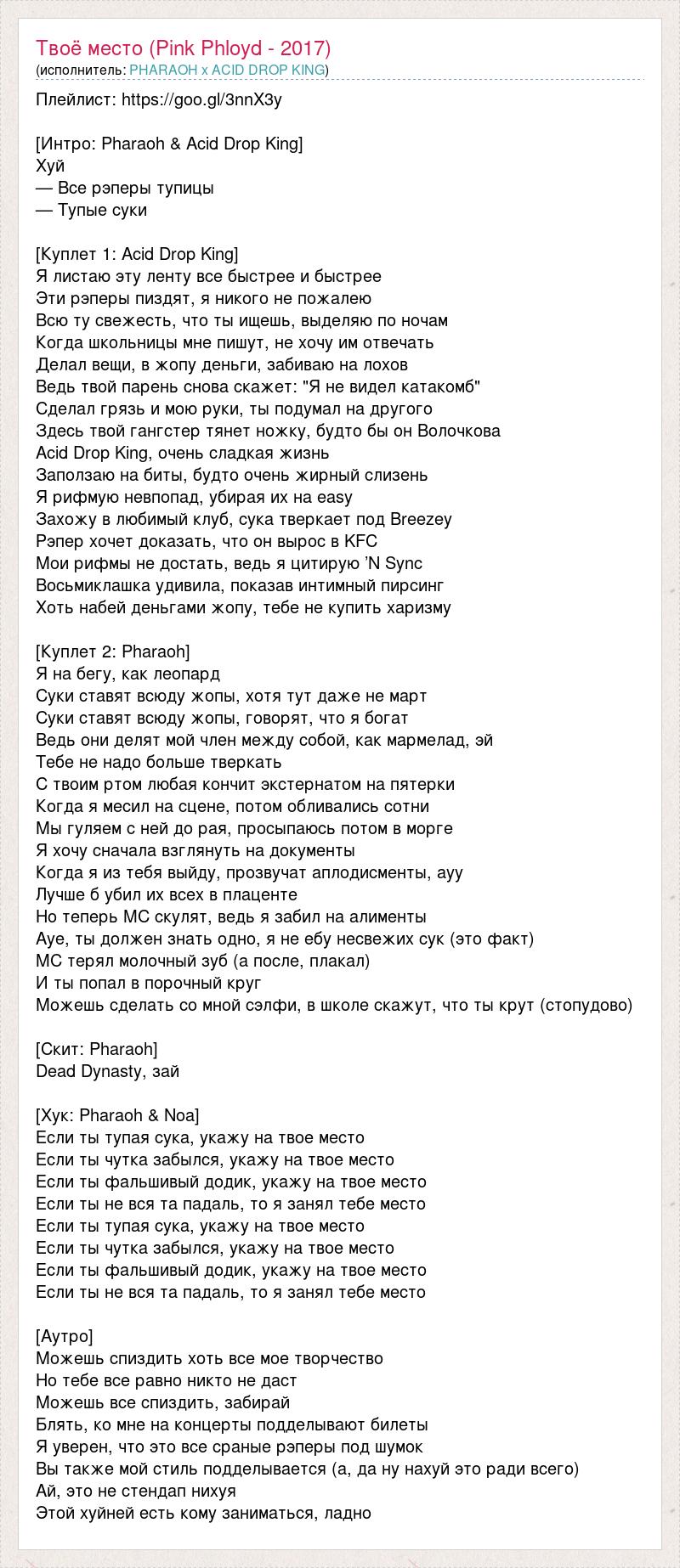 Плейлист: https://goo.gl/3nnX3y [Интро: Pharaoh & Acid Drop King] Хуй — Все рэперы тупицы — Тупые суки [Куплет 1: Acid Drop King] Я листаю эту ленту все быстрее и быстрее Эти рэперы пиздят, я никого не пожалею Всю ту свежесть, что ты ищешь, выделяю по ночам Когда школьницы мне пишут, не хочу им отвечать Делал вещи, в жопу деньги, забиваю на лохов Ведь твой парень снова скажет: "Я не видел катакомб" Сделал грязь и мою руки, ты подумал на другого Здесь твой гангстер тянет ножку, будто бы он Волочкова Acid Drop King, очень сладкая жизнь Заползаю на биты, будто очень жирный слизень Я рифмую невпопад, убирая их на easy Захожу в любимый клуб, сука тверкает под Breezey Рэпер хочет доказать, что он вырос в KFC Мои рифмы не достать, ведь я цитирую ’N Sync Восьмиклашка удивила, показав интимный пирсинг Хоть набей деньгами жопу, тебе не купить харизму [Куплет 2: Pharaoh] Я на бегу, как леопард Суки ставят всюду жопы, хотя тут даже не март Суки ставят всюду жопы, говорят, что я богат Ведь они делят мой член между собой, как мармелад, эй Тебе не надо больше тверкать С твоим ртом любая кончит экстернатом на пятерки Когда я месил на сцене, потом обливались сотни Мы гуляем с ней до рая, просыпаюсь потом в морге Я хочу сначала взглянуть на документы Когда я из тебя выйду, прозвучат аплодисменты, ayy Лучше б убил их всех в плаценте Но теперь MC скулят, ведь я забил на алименты Aye, ты должен знать одно, я не ебу несвежих сук (это факт) MC терял молочный зуб (а после, плакал) И ты попал в порочный круг Можешь сделать со мной сэлфи, в школе скажут, что ты крут (стопудово) [Скит: Pharaoh] Dead Dynasty, зай [Хук: Pharaoh & Noa] Если ты тупая сука, укажу на твое место Если ты чутка забылся, укажу на твое место Если ты фальшивый додик, укажу на твое место Если ты не вся та падаль, то я занял тебе место Если ты тупая сука, укажу на твое место Если ты чутка забылся, укажу на твое место Если ты фальшивый додик, укажу на твое место Если ты не вся та падаль, то я занял тебе место [Аутро] Можешь спиздить хоть все мое творчество Но тебе все равно никто не даст Можешь все спиздить, забирай Блять, ко мне на концерты подделывают билеты Я уверен, что это все сраные рэперы под шумок Вы также мой стиль подделывается (а, да ну нахуй это ради всего) Ай, это не стендап нихуя Этой хуйней есть кому заниматься, ладно