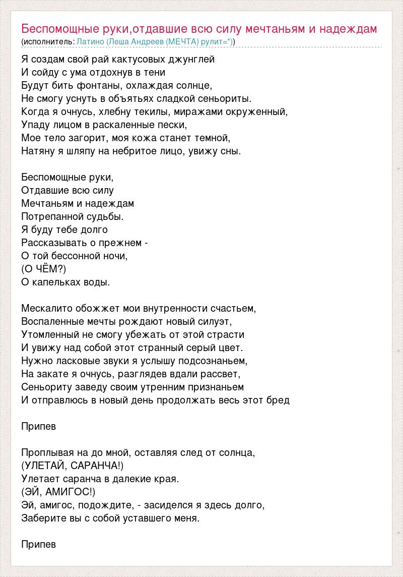 Я создам свой рай кактусовых джунглей И сойду с ума отдохнув в тени Будут бить фонтаны, охлаждая солнце, Не смогу уснуть в объятьях сладкой сеньориты. Когда я очнусь, хлебну текилы, миражами окруженный, Упаду лицом в раскаленные пески, Мое тело загорит, моя кожа станет темной, Натяну я шляпу на небритое лицо, увижу сны. Беспомощные руки, Отдавшие всю силу Мечтаньям и надеждам Потрепанной судьбы. Я буду тебе долго Рассказывать о прежнем - О той бессонной ночи, (О ЧЁМ?) О капельках воды. Мескалито обожжет мои внутренности счастьем, Воспаленные мечты рождают новый силуэт, Утомленный не смогу убежать от этой страсти И увижу над собой этот странный серый цвет. Нужно ласковые звуки я услышу подсознаньем, На закате я очнусь, разглядев вдали рассвет, Сеньориту заведу своим утренним признаньем И отправлюсь в новый день продолжать весь этот бред Припев Проплывая на до мной, оставляя след от солнца, (УЛЕТАЙ, САРАНЧА!) Улетает саранча в далекие края. (ЭЙ, АМИГОС!) Эй, амигос, подождите, - засиделся я здесь долго, Заберите вы с собой уставшего меня. Припев