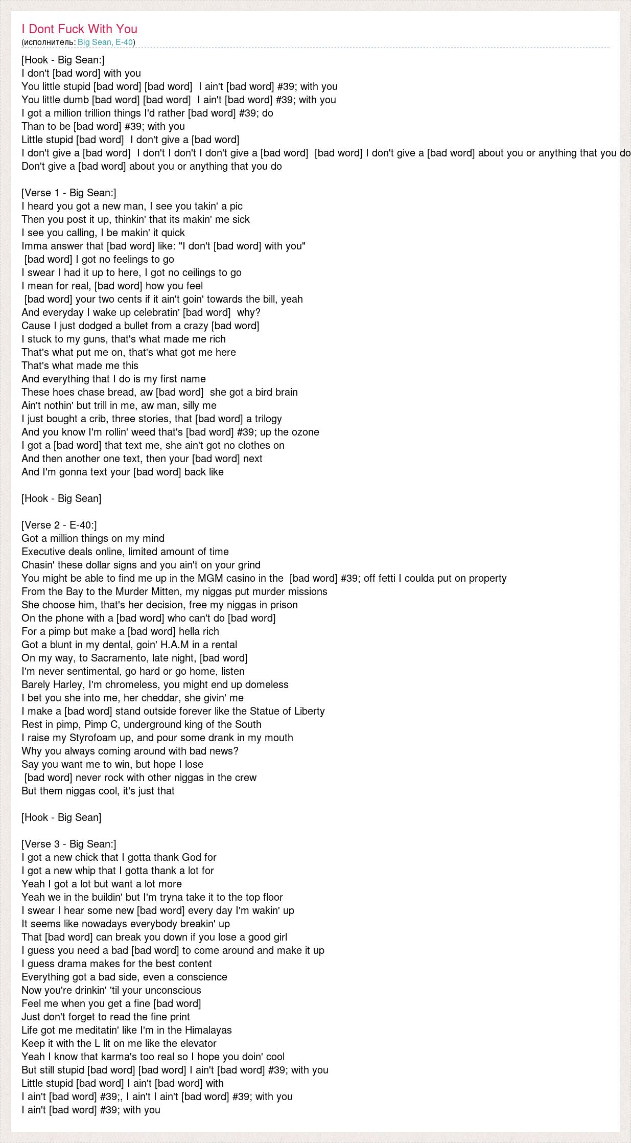 [Hook - Big Sean:] I don't [bad word] with you You little stupid [bad word] [bad word] I ain't [bad word] #39; with you You little dumb [bad word] [bad word] I ain't [bad word] #39; with you I got a million trillion things I'd rather [bad word] #39; do Than to be [bad word] #39; with you Little stupid [bad word] I don't give a [bad word] I don't give a [bad word] I don't I don't I don't give a [bad word] [bad word] I don't give a [bad word] about you or anything that you do Don't give a [bad word] about you or anything that you do [Verse 1 - Big Sean:] I heard you got a new man, I see you takin' a pic Then you post it up, thinkin' that its makin' me sick I see you calling, I be makin' it quick Imma answer that [bad word] like: "I don't [bad word] with you" [bad word] I got no feelings to go I swear I had it up to here, I got no ceilings to go I mean for real, [bad word] how you feel [bad word] your two cents if it ain't goin' towards the bill, yeah And everyday I wake up celebratin' [bad word] why? Cause I just dodged a bullet from a crazy [bad word] I stuck to my guns, that's what made me rich That's what put me on, that's what got me here That's what made me this And everything that I do is my first name These hoes chase bread, aw [bad word] she got a bird brain Ain't nothin' but trill in me, aw man, silly me I just bought a crib, three stories, that [bad word] a trilogy And you know I'm rollin' weed that's [bad word] #39; up the ozone I got a [bad word] that text me, she ain't got no clothes on And then another one text, then your [bad word] next And I'm gonna text your [bad word] back like [Hook - Big Sean] [Verse 2 - E-40:] Got a million things on my mind Executive deals online, limited amount of time Chasin' these dollar signs and you ain't on your grind You might be able to find me up in the MGM casino in the [bad word] #39; off fetti I coulda put on property From the Bay to the Murder Mitten, my niggas put murder missions She choose him, that's her decision, free my niggas in prison On the phone with a [bad word] who can't do [bad word] For a pimp but make a [bad word] hella rich Got a blunt in my dental, goin' H.A.M in a rental On my way, to Sacramento, late night, [bad word] I'm never sentimental, go hard or go home, listen Barely Harley, I'm chromeless, you might end up domeless I bet you she into me, her cheddar, she givin' me I make a [bad word] stand outside forever like the Statue of Liberty Rest in pimp, Pimp C, underground king of the South I raise my Styrofoam up, and pour some drank in my mouth Why you always coming around with bad news? Say you want me to win, but hope I lose [bad word] never rock with other niggas in the crew But them niggas cool, it's just that [Hook - Big Sean] [Verse 3 - Big Sean:] I got a new chick that I gotta thank God for I got a new whip that I gotta thank a lot for Yeah I got a lot but want a lot more Yeah we in the buildin' but I'm tryna take it to the top floor I swear I hear some new [bad word] every day I'm wakin' up It seems like nowadays everybody breakin' up That [bad word] can break you down if you lose a good girl I guess you need a bad [bad word] to come around and make it up I guess drama makes for the best content Everything got a bad side, even a conscience Now you're drinkin' 'til your unconscious Feel me when you get a fine [bad word] Just don't forget to read the fine print Life got me meditatin' like I'm in the Himalayas Keep it with the L lit on me like the elevator Yeah I know that karma's too real so I hope you doin' cool But still stupid [bad word] [bad word] I ain't [bad word] #39; with you Little stupid [bad word] I ain't [bad word] with I ain't [bad word] #39;, I ain't I ain't [bad word] #39; with you I ain't [bad word] #39; with you