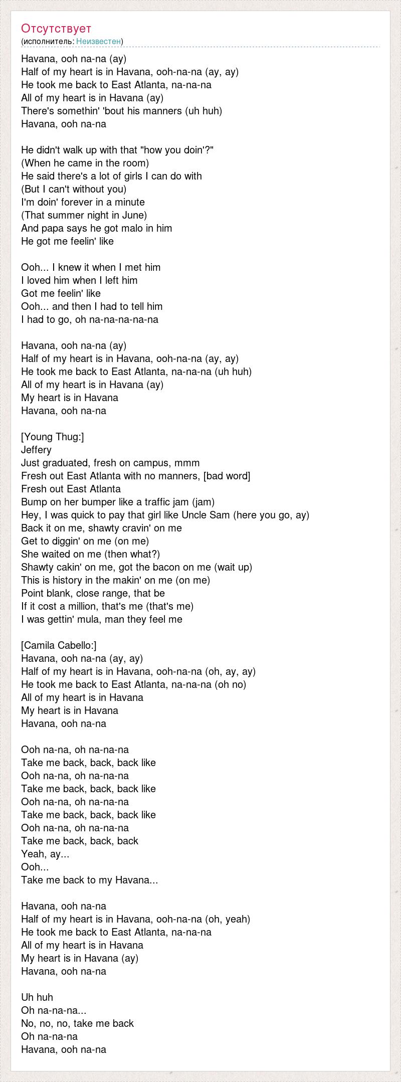 Havana, ooh na-na (ay) Half of my heart is in Havana, ooh-na-na (ay, ay) He took me back to East Atlanta, na-na-na All of my heart is in Havana (ay) There's somethin' 'bout his manners (uh huh) Havana, ooh na-na He didn't walk up with that "how you doin'?" (When he came in the room) He said there's a lot of girls I can do with (But I can't without you) I'm doin' forever in a minute (That summer night in June) And papa says he got malo in him He got me feelin' like Ooh... I knew it when I met him I loved him when I left him Got me feelin' like Ooh... and then I had to tell him I had to go, oh na-na-na-na-na Havana, ooh na-na (ay) Half of my heart is in Havana, ooh-na-na (ay, ay) He took me back to East Atlanta, na-na-na (uh huh) All of my heart is in Havana (ay) My heart is in Havana Havana, ooh na-na [Young Thug:] Jeffery Just graduated, fresh on campus, mmm Fresh out East Atlanta with no manners, [bad word] Fresh out East Atlanta Bump on her bumper like a traffic jam (jam) Hey, I was quick to pay that girl like Uncle Sam (here you go, ay) Back it on me, shawty cravin' on me Get to diggin' on me (on me) She waited on me (then what?) Shawty cakin' on me, got the bacon on me (wait up) This is history in the makin' on me (on me) Point blank, close range, that be If it cost a million, that's me (that's me) I was gettin' mula, man they feel me [Camila Cabello:] Havana, ooh na-na (ay, ay) Half of my heart is in Havana, ooh-na-na (oh, ay, ay) He took me back to East Atlanta, na-na-na (oh no) All of my heart is in Havana My heart is in Havana Havana, ooh na-na Ooh na-na, oh na-na-na Take me back, back, back like Ooh na-na, oh na-na-na Take me back, back, back like Ooh na-na, oh na-na-na Take me back, back, back like Ooh na-na, oh na-na-na Take me back, back, back Yeah, ay... Ooh... Take me back to my Havana... Havana, ooh na-na Half of my heart is in Havana, ooh-na-na (oh, yeah) He took me back to East Atlanta, na-na-na All of my heart is in Havana My heart is in Havana (ay) Havana, ooh na-na Uh huh Oh na-na-na... No, no, no, take me back Oh na-na-na Havana, ooh na-na