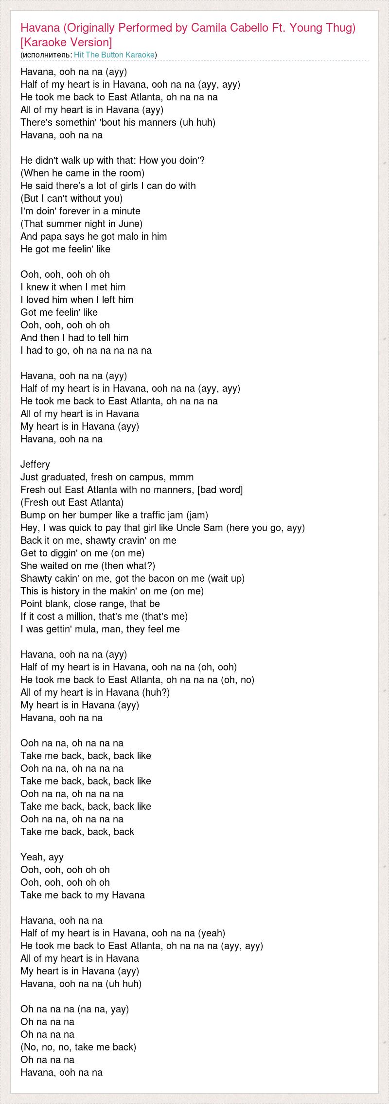 Havana, ooh na na (ayy) Half of my heart is in Havana, ooh na na (ayy, ayy) He took me back to East Atlanta, oh na na na All of my heart is in Havana (ayy) There's somethin' 'bout his manners (uh huh) Havana, ooh na na He didn't walk up with that: How you doin'? (When he came in the room) He said there’s a lot of girls I can do with (But I can't without you) I'm doin' forever in a minute (That summer night in June) And papa says he got malo in him He got me feelin' like Ooh, ooh, ooh oh oh I knew it when I met him I loved him when I left him Got me feelin' like Ooh, ooh, ooh oh oh And then I had to tell him I had to go, oh na na na na na Havana, ooh na na (ayy) Half of my heart is in Havana, ooh na na (ayy, ayy) He took me back to East Atlanta, oh na na na All of my heart is in Havana My heart is in Havana (ayy) Havana, ooh na na Jeffery Just graduated, fresh on campus, mmm Fresh out East Atlanta with no manners, [bad word] (Fresh out East Atlanta) Bump on her bumper like a traffic jam (jam) Hey, I was quick to pay that girl like Uncle Sam (here you go, ayy) Back it on me, shawty cravin' on me Get to diggin' on me (on me) She waited on me (then what?) Shawty cakin' on me, got the bacon on me (wait up) This is history in the makin' on me (on me) Point blank, close range, that be If it cost a million, that's me (that's me) I was gettin' mula, man, they feel me Havana, ooh na na (ayy) Half of my heart is in Havana, ooh na na (oh, ooh) He took me back to East Atlanta, oh na na na (oh, no) All of my heart is in Havana (huh?) My heart is in Havana (ayy) Havana, ooh na na Ooh na na, oh na na na Take me back, back, back like Ooh na na, oh na na na Take me back, back, back like Ooh na na, oh na na na Take me back, back, back like Ooh na na, oh na na na Take me back, back, back Yeah, ayy Ooh, ooh, ooh oh oh Ooh, ooh, ooh oh oh Take me back to my Havana Havana, ooh na na Half of my heart is in Havana, ooh na na (yeah) He took me back to East Atlanta, oh na na na (ayy, ayy) All of my heart is in Havana My heart is in Havana (ayy) Havana, ooh na na (uh huh) Oh na na na (na na, yay) Oh na na na Oh na na na (No, no, no, take me back) Oh na na na Havana, ooh na na