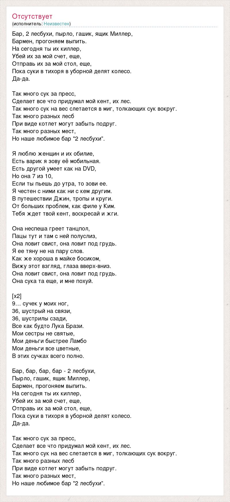 Бар, 2 лесбухи, пырло, гашик, ящик Миллер, Бармен, прогоняем выпить. На сегодня ты их киллер, Убей их за мой счет, еще, Отправь их за мой стол, еще, Пока суки в тихоря в уборной делят колесо. Да-да. Так много сук за пресс, Сделает все что придумал мой кент, их лес. Так много сук на вес слетается в миг, толкающих сук вокруг. Так много разных лесб При виде котлет могут забыть подруг. Так много разных мест, Но наше любимое бар "2 лесбухи”. Я люблю женщин и их обилие, Есть варик я зову её мобильная. Есть другой умеет как на DVD, Но она 7 из 10, Если ты пьешь до утра, то зови ее. Я честен с ними как ни с кем другим. В путешествии Джин, тропы и круги. От больших проблем, как филе у Ким. Тебя ждет твой кент, воскресай и жги. Она неспеша греет танцпол, Пацы тут и там с ней полуслиз, Она ловит свист, она ловит под грудь. Я ее тяну не на пару слов. Как же хороша в майке босиком, Вижу этот взгляд, глаза вверх-вниз. Она ловит свист, она ловит под грудь. Она сука та еще, и мне похуй. [х2] 9… сучек у моих ног, 36, шустрый на связи, 36, шустрилы сзади, Все как будто Лука Брази. Мои сестры не святые, Мои деньги быстрее Ламбо Мои деньги все цветные, В этих сучках всего полно. Бар, бар, бар, бар - 2 лесбухи, Пырло, гашик, ящик Миллер, Бармен, прогоняем выпить. На сегодня ты их киллер, Убей их за мой счет, еще, Отправь их за мой стол, еще, Пока суки в тихоря в уборной делят колесо. Да-да. Так много сук за пресс, Сделает все что придумал мой кент, их лес. Так много сук на вес слетается в миг, толкающих сук вокруг. Так много разных лесб При виде котлет могут забыть подруг. Так много разных мест, Но наше любимое бар "2 лесбухи”.