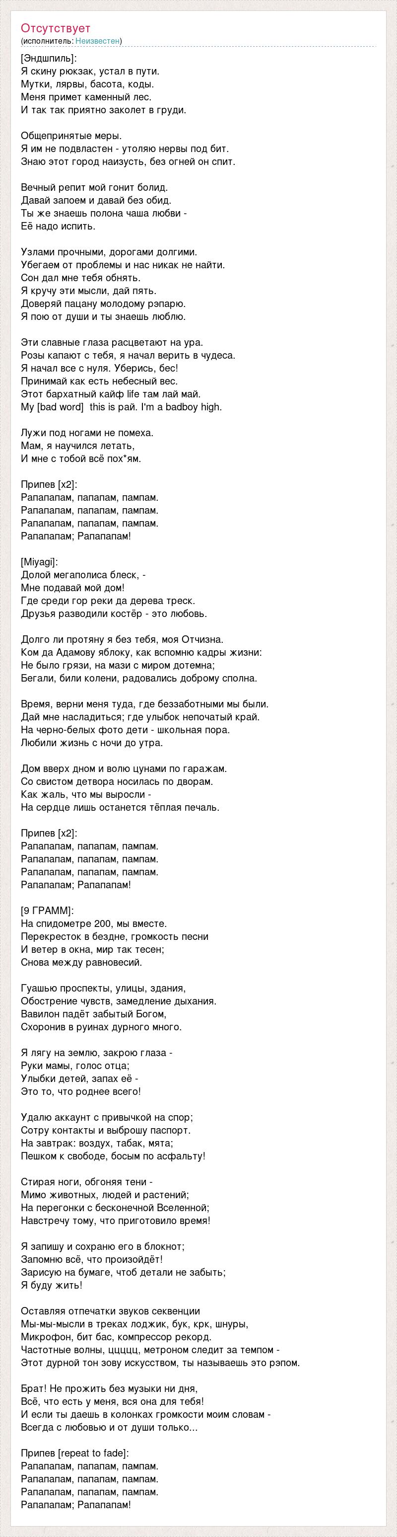 [Эндшпиль]: Я скину рюкзак, устал в пути. Мутки, лярвы, басота, коды. Меня примет каменный лес. И так так приятно заколет в груди. Общепринятые меры. Я им не подвластен - утоляю нервы под бит. Знаю этот город наизусть, без огней он спит. Вечный репит мой гонит болид. Давай запоем и давай без обид. Ты же знаешь полона чаша любви - Её надо испить. Узлами прочными, дорогами долгими. Убегаем от проблемы и нас никак не найти. Сон дал мне тебя обнять. Я кручу эти мысли, дай пять. Доверяй пацану молодому рэпарю. Я пою от души и ты знаешь люблю. Эти славные глаза расцветают на ура. Розы капают с тебя, я начал верить в чудеса. Я начал все с нуля. Уберись, бес! Принимай как есть небесный вес. Этот бархатный кайф life там лай май. My [bad word] this is рай. I'm a badboy high. Лужи под ногами не помеха. Мам, я научился летать, И мне с тобой всё пох*ям. Припев [x2]: Рапапапам, папапам, пампам. Рапапапам, папапам, пампам. Рапапапам, папапам, пампам. Рапапапам; Рапапапам! [Miyagi]: Долой мегаполиса блеск, - Мне подавай мой дом! Где среди гор реки да дерева треск. Друзья разводили костёр - это любовь. Долго ли протяну я без тебя, моя Отчизна. Ком да Адамову яблоку, как вспомню кадры жизни: Не было грязи, на мази с миром дотемна; Бегали, били колени, радовались доброму сполна. Время, верни меня туда, где беззаботными мы были. Дай мне насладиться; где улыбок непочатый край. На черно-белых фото дети - школьная пора. Любили жизнь с ночи до утра. Дом вверх дном и волю цунами по гаражам. Со свистом детвора носилась по дворам. Как жаль, что мы выросли - На сердце лишь останется тёплая печаль. Припев [x2]: Рапапапам, папапам, пампам. Рапапапам, папапам, пампам. Рапапапам, папапам, пампам. Рапапапам; Рапапапам! [9 ГРАММ]: На спидометре 200, мы вместе. Перекресток в бездне, громкость песни И ветер в окна, мир так тесен; Снова между равновесий. Гуашью проспекты, улицы, здания, Обострение чувств, замедление дыхания. Вавилон падёт забытый Богом, Схоронив в руинах дурного много. Я лягу на землю, закрою глаза - Руки мамы, голос отца; Улыбки детей, запах её - Это то, что роднее всего! Удалю аккаунт с привычкой на спор; Сотру контакты и выброшу паспорт. На завтрак: воздух, табак, мята; Пешком к свободе, босым по асфальту! Стирая ноги, обгоняя тени - Мимо животных, людей и растений; На перегонки с бесконечной Вселенной; Навстречу тому, что приготовило время! Я запишу и сохраню его в блокнот; Запомню всё, что произойдёт! Зарисую на бумаге, чтоб детали не забыть; Я буду жить! Оставляя отпечатки звуков секвенции Мы-мы-мысли в треках лоджик, бук, крк, шнуры, Микрофон, бит бас, компрессор рекорд. Частотные волны, ццццц, метроном следит за темпом - Этот дурной тон зову искусством, ты называешь это рэпом. Брат! Не прожить без музыки ни дня, Всё, что есть у меня, вся она для тебя! И если ты даешь в колонках громкости моим словам - Всегда с любовью и от души только... Припев [repeat to fade]: Рапапапам, папапам, пампам. Рапапапам, папапам, пампам. Рапапапам, папапам, пампам. Рапапапам; Рапапапам!