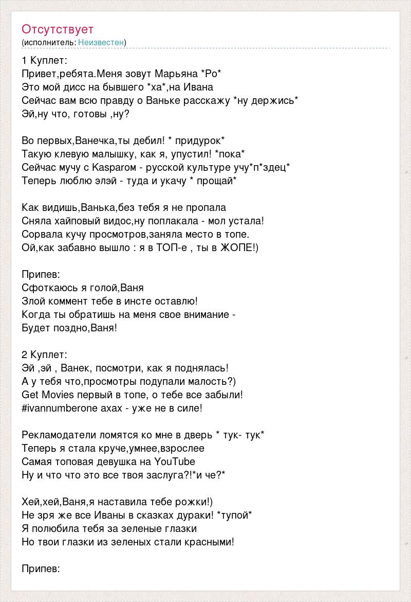 1 Куплет: Привет,ребята.Меня зовут Марьяна *Ро* Это мой дисс на бывшего *ха*,на Ивана Сейчас вам всю правду о Ваньке расскажу *ну держись* Эй,ну что, готовы ,ну? Во первых,Ванечка,ты дебил! * придурок* Такую клевую малышку, как я, упустил! *пока* Сейчас мучу с Kasparом - русской культуре учу*п*здец* Теперь люблю элэй - туда и укачу * прощай* Как видишь,Ванька,без тебя я не пропала Сняла хайповый видос,ну поплакала - мол устала! Сорвала кучу просмотров,заняла место в топе. Ой,как забавно вышло : я в ТОП-е , ты в ЖОПЕ!) Припев: Сфоткаюсь я голой,Ваня Злой коммент тебе в инсте оставлю! Когда ты обратишь на меня свое внимание - Будет поздно,Ваня! 2 Куплет: Эй ,эй , Ванек, посмотри, как я поднялась! А у тебя что,просмотры подупали малость?) Get Movies первый в топе, о тебе все забыли! #ivannumberone ахах - уже не в силе! Рекламодатели ломятся ко мне в дверь * тук- тук* Теперь я стала круче,умнее,взрослее Самая топовая девушка на YouTube Ну и что что это все твоя заслуга?!*и че?* Хей,хей,Ваня,я наставила тебе рожки!) Не зря же все Иваны в сказках дураки! *тупой* Я полюбила тебя за зеленые глазки Но твои глазки из зеленых стали красными! Припев: