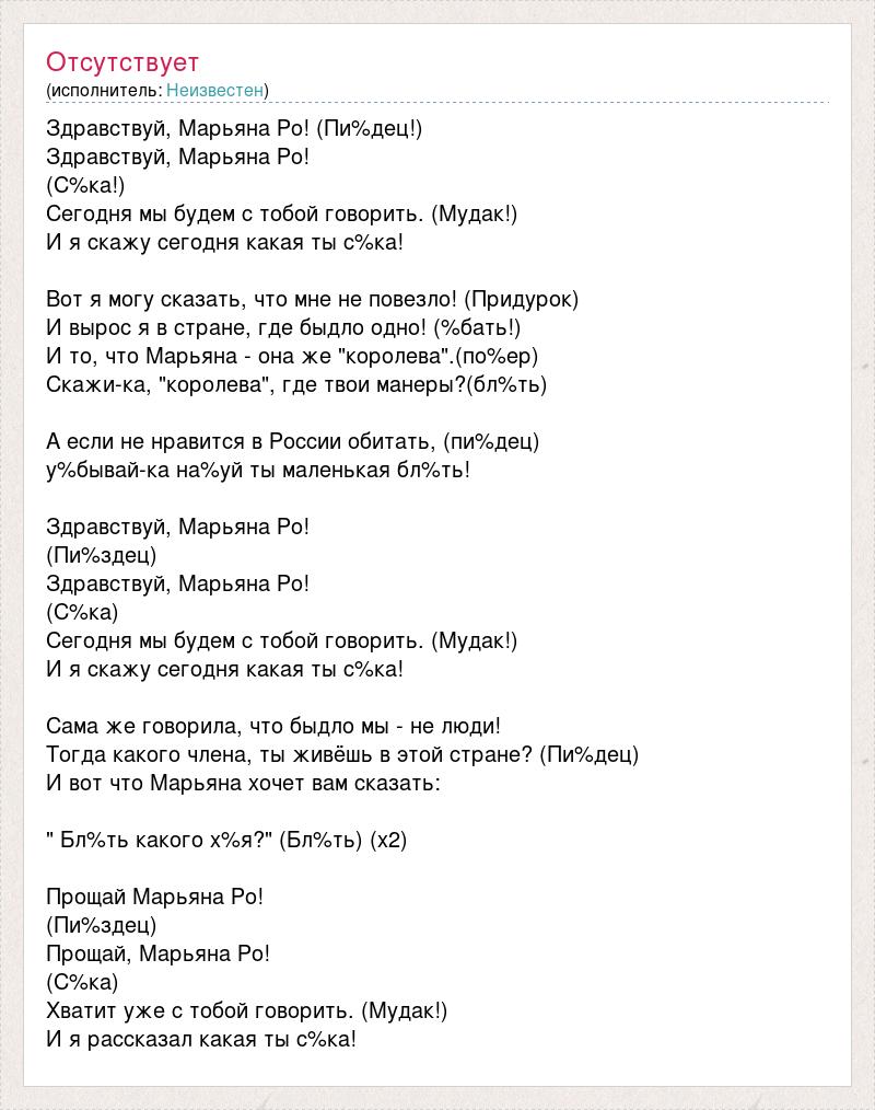 Здравствуй, Марьяна Ро! (Пи%дец!) Здравствуй, Марьяна Ро! (С%ка!) Сегодня мы будем с тобой говорить. (Мудак!) И я скажу сегодня какая ты с%ка! Вот я могу сказать, что мне не повезло! (Придурок) И вырос я в стране, где быдло одно! (%бать!) И то, что Марьяна - она же "королева".(по%ер) Скажи-ка, "королева", где твои манеры?(бл%ть) А если не нравится в России обитать, (пи%дец) у%бывай-ка на%уй ты маленькая бл%ть! Здравствуй, Марьяна Ро! (Пи%здец) Здравствуй, Марьяна Ро! (С%ка) Сегодня мы будем с тобой говорить. (Мудак!) И я скажу сегодня какая ты с%ка! Сама же говорила, что быдло мы - не люди! Тогда какого члена, ты живёшь в этой стране? (Пи%дец) И вот что Марьяна хочет вам сказать: " Бл%ть какого х%я?" (Бл%ть) (х2) Прощай Марьяна Ро! (Пи%здец) Прощай, Марьяна Ро! (С%ка) Хватит уже с тобой говорить. (Мудак!) И я рассказал какая ты с%ка!