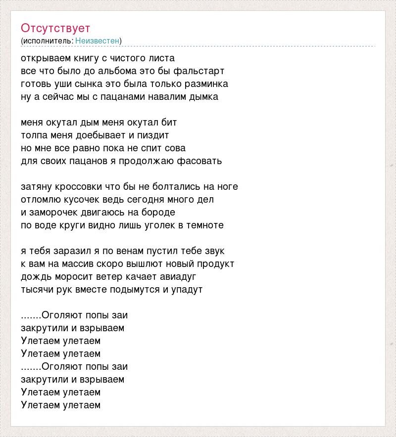 открываем книгу с чистого листа все что было до альбома это бы фальстарт готовь уши сынка это была только разминка ну а сейчас мы с пацанами навалим дымка меня окутал дым меня окутал бит толпа меня доебывает и пиздит но мне все равно пока не спит сова для своих пацанов я продолжаю фасовать затяну кроссовки что бы не болтались на ноге отломлю кусочек ведь сегодня много дел и заморочек двигаюсь на бороде по воде круги видно лишь уголек в темноте я тебя заразил я по венам пустил тебе звук к вам на массив скоро вышлют новый продукт дождь моросит ветер качает авиадуг тысячи рук вместе подымутся и упадут .......Оголяют попы заи закрутили и взрываем Улетаем улетаем Улетаем улетаем .......Оголяют попы заи закрутили и взрываем Улетаем улетаем Улетаем улетаем
